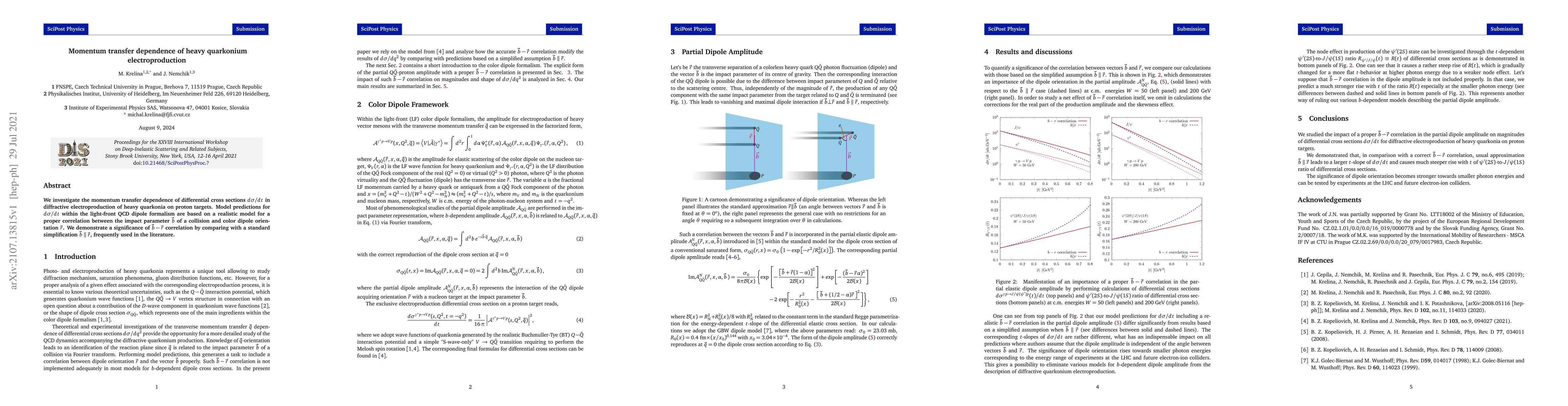 We investigate the momentum transfer dependence of differential cross sections $d\sigma/dt$ in diffractive electroproduction of heavy quarkonia on proton targets. Model predictions for $d\sigma/dt$ within the light-front QCD dipole formalism are based on a realistic model for a proper correlation between the impact parameter $\vec b$ of a collision and color dipole orientation $\vec r$. We demonstrate a significance of $\vec b-\vec r$ correlation by comparing with a standard simplification $\vec{b}\parallel\vec{r}$, frequently used in the literature.