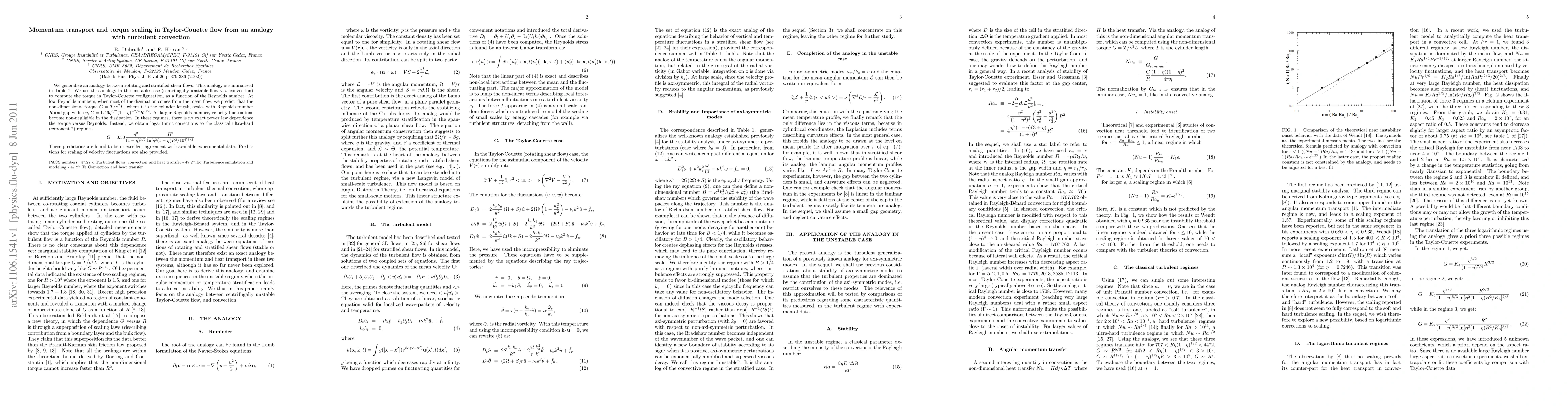 We generalize an analogy between rotating and stratified shear flows. This analogy is summarized in Table 1. We use this analogy in the unstable case (centrifugally unstable flow v.s. convection) to compute the torque in Taylor-Couette configuration, as a function of the Reynolds number. At low Reynolds numbers, when most of the dissipation comes from the mean flow, we predict that the non-dimensional torque $G=T/\nu^2L$, where $L$ is the cylinder length, scales with Reynolds number $R$ and gap width $\eta$, $G=1.46 \eta^{3/2} (1-\eta)^{-7/4}R^{3/2}$. At larger Reynolds number, velocity fluctuations become non-negligible in the dissipation. In these regimes, there is no exact power law dependence the torque versus Reynolds. Instead, we obtain logarithmic corrections to the classical ultra-hard (exponent 2) regimes: $$ G=0.50\frac{\eta^{2}}{(1-\eta)^{3/2}}\frac{R^{2}}{\ln[\eta^2(1-\eta)R^ 2/10^4]^{3/2}}.$$ These predictions are found to be in excellent agreement with available experimental data. Predictions for scaling of velocity fluctuations are also provided.