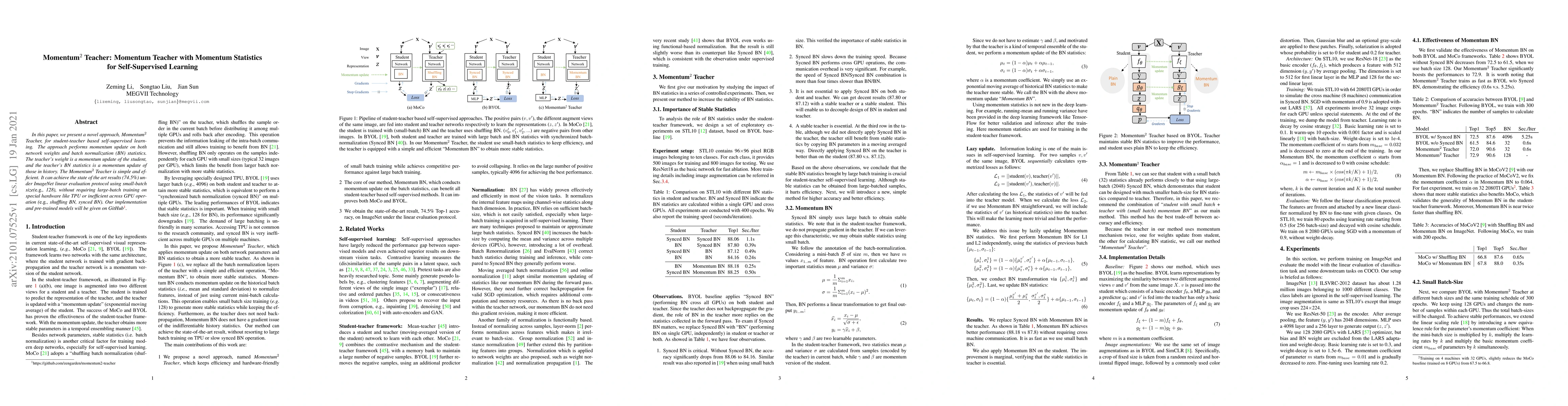 Momentum^2 Teacher achieves state-of-the-art results in self-supervised learning without requiring large-batch training on special hardware, using a simple and efficient approach that updates both network weights and batch normalization statistics with momentum.