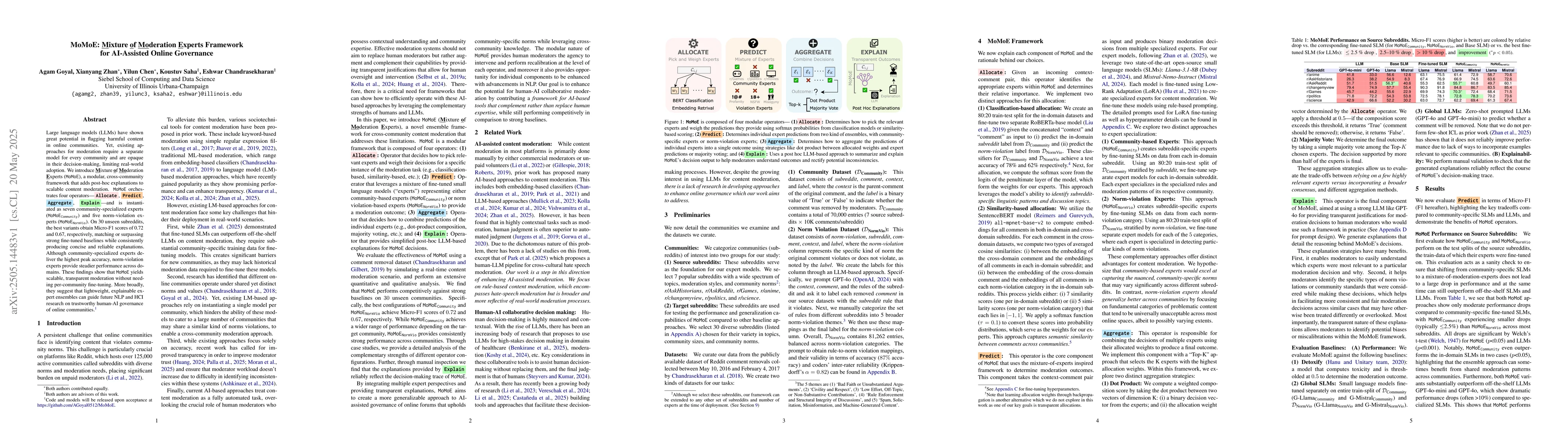 MoMoE, a Mixture of Moderation Experts framework that combines four operators and community/norm-violation specialized experts for transparent and scalable content moderation.