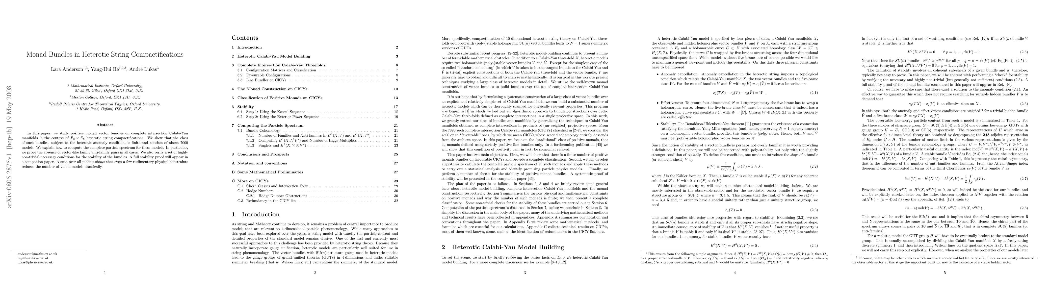 This paper investigates positive monad vector bundles on Calabi-Yau manifolds in heterotic string compactifications, revealing that the number of such bundles satisfying the anomaly condition is finite (around 7000 models). It demonstrates the absence of vector-like family anti-family pairs and verifies necessary conditions for bundle stability, while noting that even basic physical constraints significantly reduce viable models.