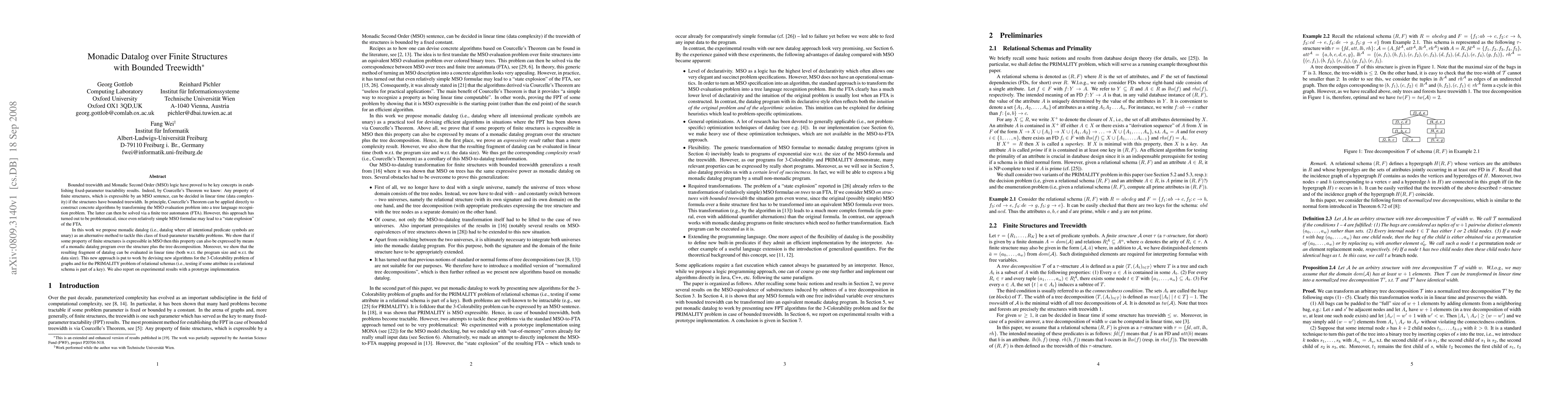 This paper proposes monadic datalog as an alternative to MSO logic for solving fixed-parameter tractable problems on finite structures with bounded treewidth. It demonstrates that MSO properties can be expressed in monadic datalog and evaluated in linear time, providing new algorithms for graph 3-Colorability and relational schema primality testing.