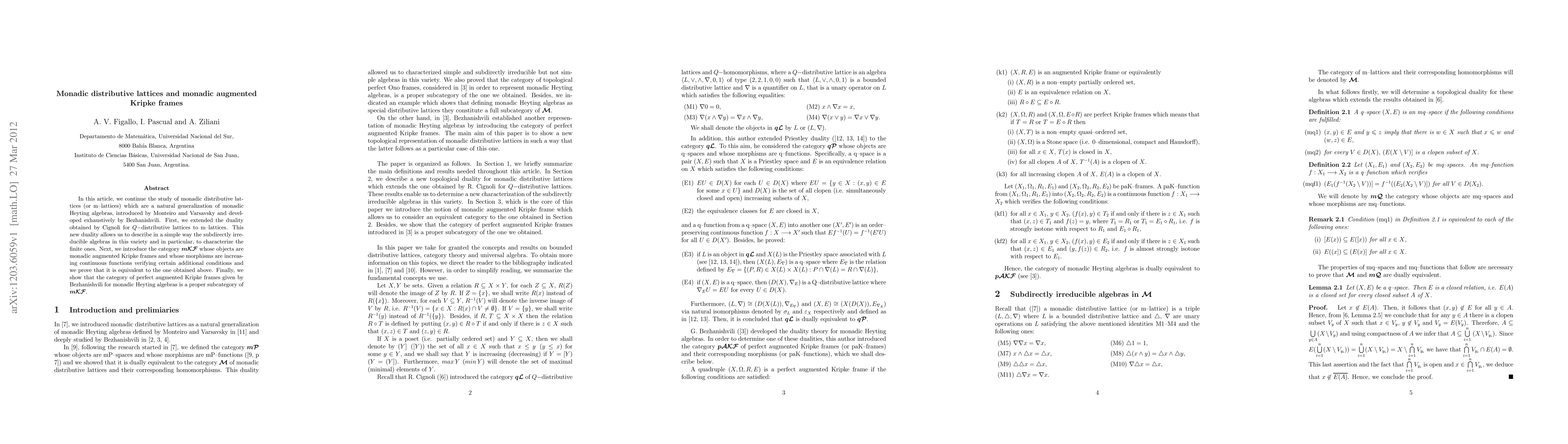 This paper extends the duality between monadic distributive lattices (m-lattices) and Q-distributive lattices to m-lattices, characterizing their subdirectly irreducible algebras. It introduces the category mKF of monadic augmented Kripke frames, proving its equivalence to the category of m-lattices, and shows that the category of perfect augmented Kripke frames for monadic Heyting algebras is a subcategory of mKF.