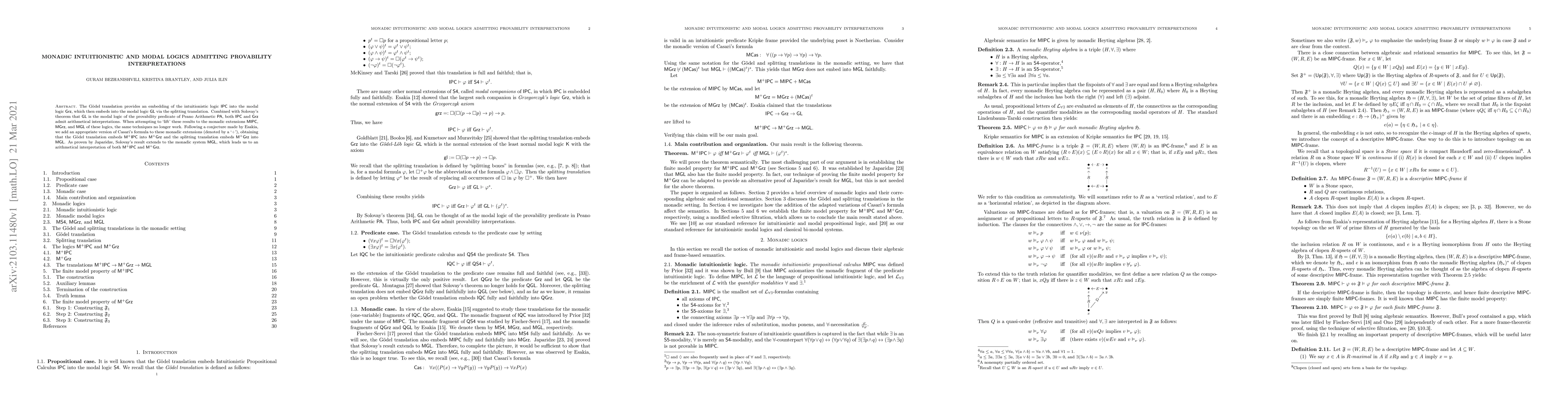 The G\"odel translation provides an embedding of the intuitionistic logic $\mathsf{IPC}$ into the modal logic $\mathsf{Grz}$, which then embeds into the modal logic $\mathsf{GL}$ via the splitting translation. Combined with Solovay's theorem that $\mathsf{GL}$ is the modal logic of the provability predicate of Peano Arithmetic $\mathsf{PA}$, both $\mathsf{IPC}$ and $\mathsf{Grz}$ admit arithmetical interpretations. When attempting to 'lift' these results to the monadic extensions $\mathsf{MIPC}$, $\mathsf{MGrz}$, and $\mathsf{MGL}$ of these logics, the same techniques no longer work. Following a conjecture made by Esakia, we add an appropriate version of Casari's formula to these monadic extensions (denoted by a '+'), obtaining that the G\"odel translation embeds $\mathsf{M^{+}IPC}$ into $\mathsf{M^{+}Grz}$ and the splitting translation embeds $\mathsf{M^{+}Grz}$ into $\mathsf{MGL}$. As proven by Japaridze, Solovay's result extends to the monadic system $\mathsf{MGL}$, which leads us to an arithmetical interpretation of both $\mathsf{M^{+}IPC}$ and $\mathsf{M^{+}Grz}$.