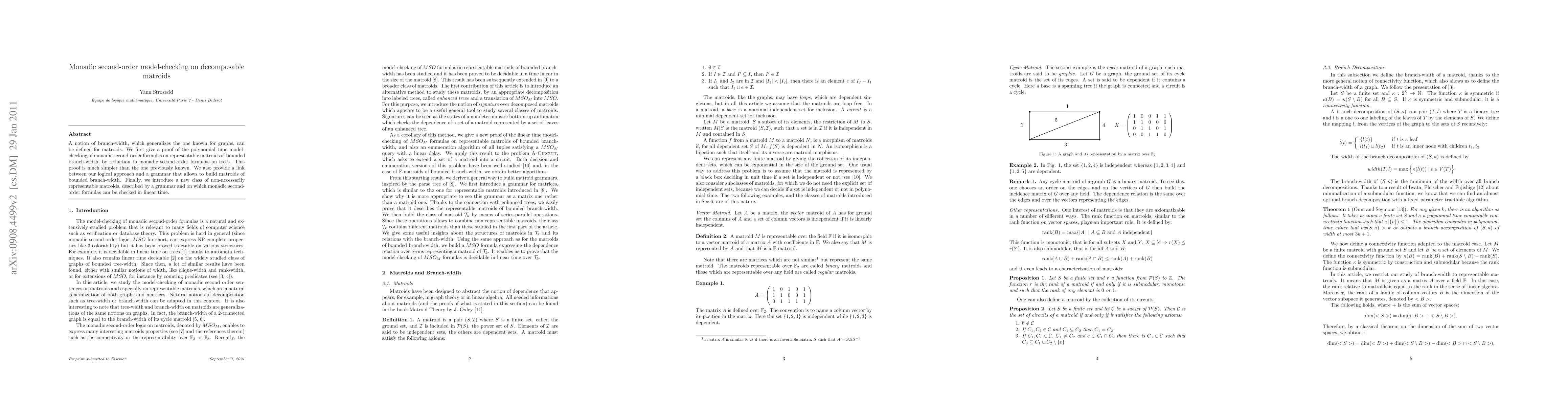 A notion of branch-width, which generalizes the one known for graphs, can be defined for matroids. We first give a proof of the polynomial time model-checking of monadic second-order formulas on representable matroids of bounded branch-width, by reduction to monadic second-order formulas on trees. This proof is much simpler than the one previously known. We also provide a link between our logical approach and a grammar that allows to build matroids of bounded branch-width. Finally, we introduce a new class of non-necessarily representable matroids, described by a grammar and on which monadic second-order formulas can be checked in linear time.