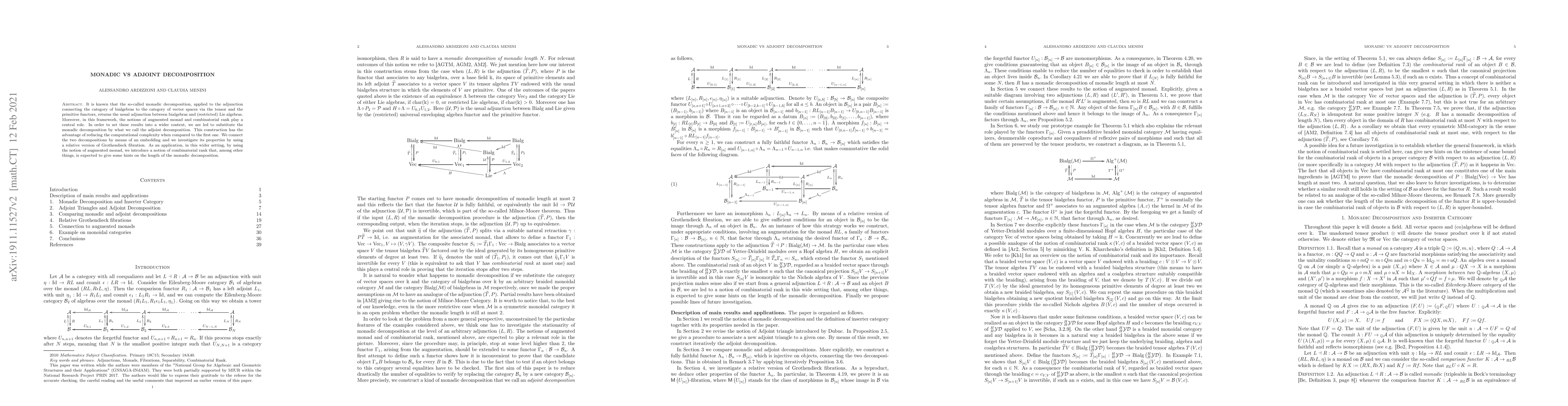 This paper contrasts monadic and adjoint decompositions in the context of adjunctions between bialgebras and Lie algebras, showing that the adjoint decomposition reduces computational complexity. It introduces a relative Grothendieck fibration to connect both decompositions and uses augmented monads to propose a combinatorial rank measure, potentially indicating the length of the monadic decomposition.