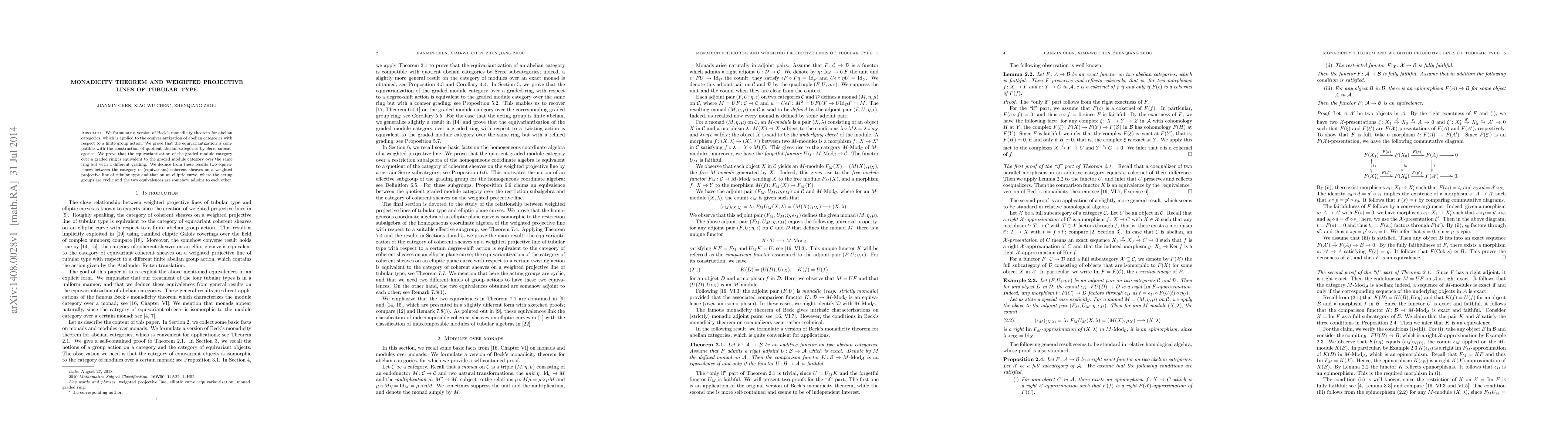 This paper formulates a version of Beck's monadicity theorem for abelian categories and applies it to the equivariantization of these categories under finite group actions. It establishes equivalences between equivariant graded module categories and deduces two adjoint equivalences between coherent sheaves on weighted projective lines of tubular type and elliptic curves.