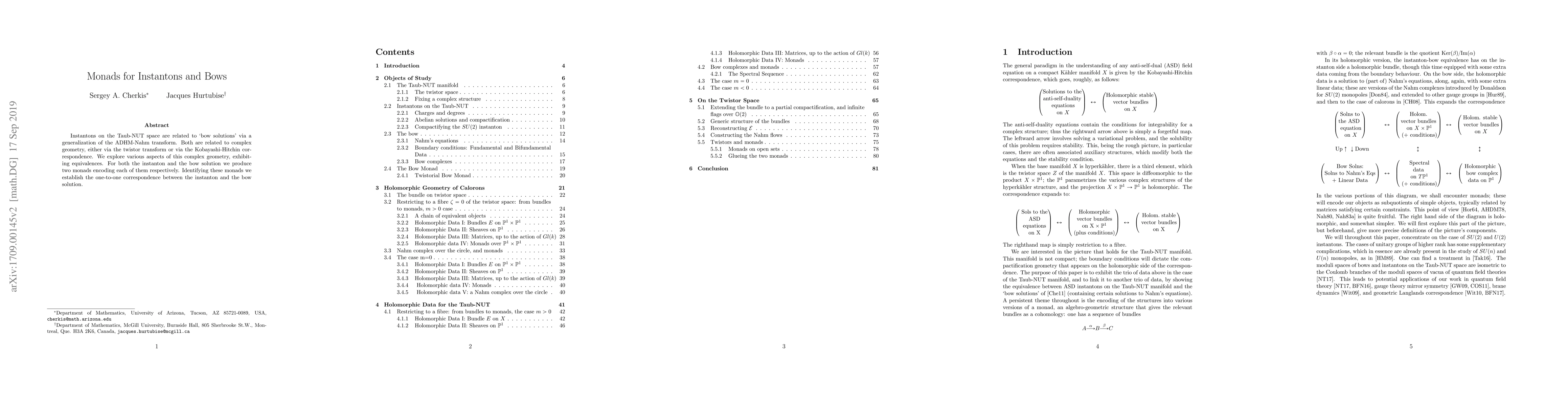 Instantons on the Taub-NUT space are related to `bow solutions' via a generalization of the ADHM-Nahm transform. Both are related to complex geometry, either via the twistor transform or via the Kobayashi-Hitchin correspondence. We explore various aspects of this complex geometry, exhibiting equivalences. For both the instanton and the bow solution we produce two monads encoding each of them respectively. Identifying these monads we establish the one-to-one correspondence between the instanton and the bow solution.