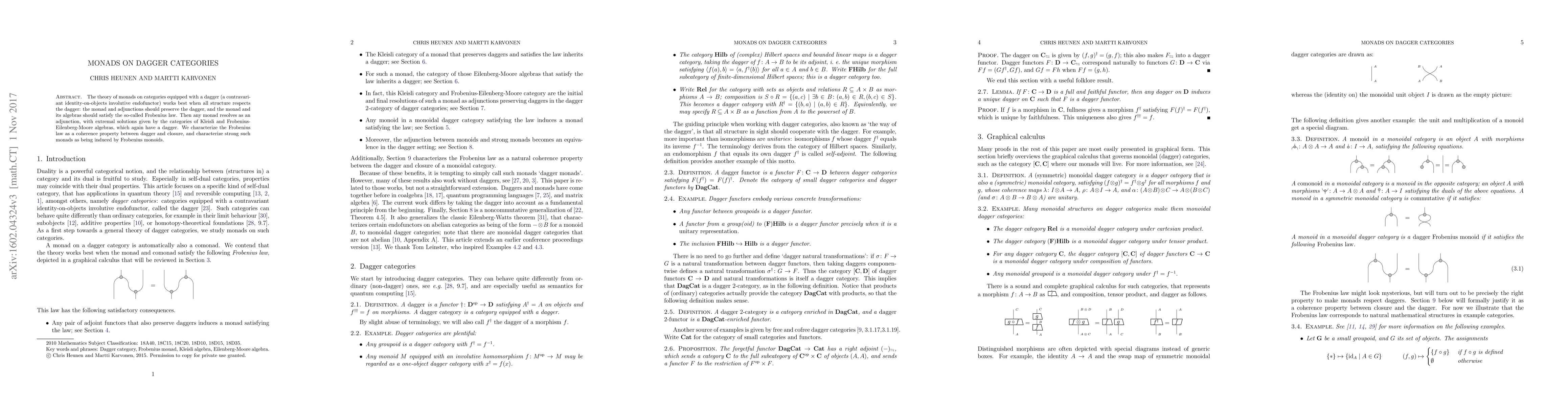 This paper explores monads on dagger categories, emphasizing monads that respect the dagger structure, leading to resolutions as adjunctions and the identification of Frobenius laws as coherence properties between dagger and closure. It characterizes strong monads as those induced by Frobenius monoids.