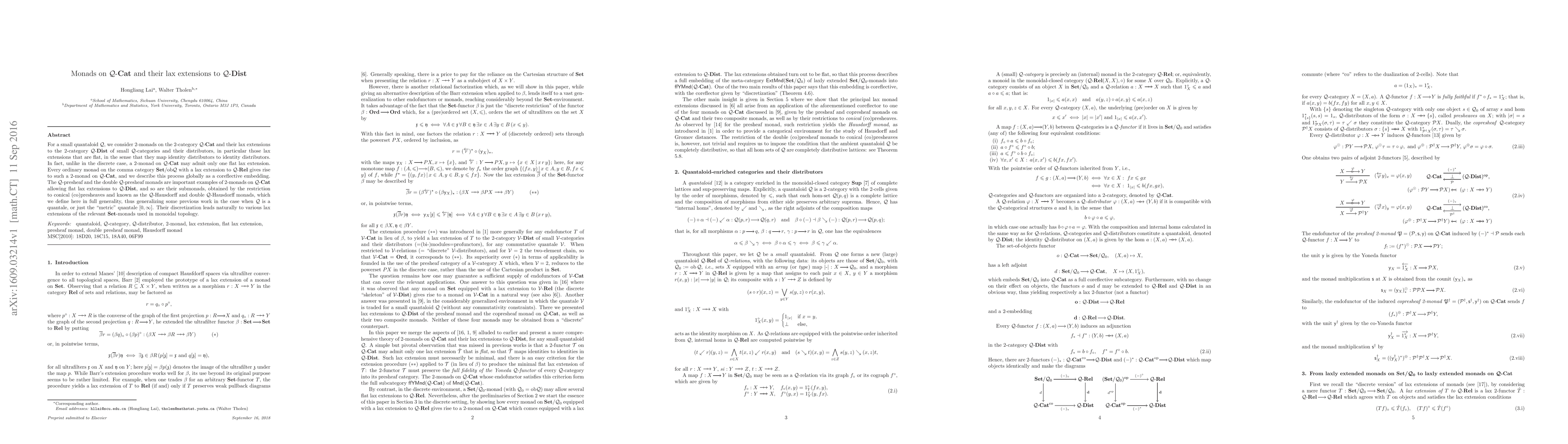 For a small quantaloid $\mathcal{Q}$, we consider 2-monads on the 2-category $\mathcal{Q}$-$\bf{Cat}$ and their lax extensions to the 2-category $\mathcal{Q}$-$\bf{Dist}$ of small $\mathcal{Q}$-categories and their distributors, in particular those lax extensions that are flat, in the sense that they map identity distributors to identity distributors. In fact, unlike in the discrete case, a 2-monad on $\mathcal{Q}$-$\bf{Cat}$ may admit only one flat lax extension. Every ordinary monad on the comma category $\bf{Set}/{\rm ob}\mathcal{Q}$ with a lax extension to $\mathcal{Q}$-$\bf{Rel}$ gives rise to such a 2-monad on $\mathcal{Q}$-$\bf{Cat}$, and we describe this process globally as a coreflective embedding. The $\mathcal{Q}$-presheaf and the double $\mathcal{Q}$-presheaf monads are important examples of 2-monads on $\mathcal{Q}$-$\bf{Cat}$ allowing flat lax extensions to $\mathcal{Q}$-$\bf{Dist}$, and so are their submonads, obtained by the restriction to conical (co)presheaves and known as the $\mathcal{Q}$-Hausdorff and double $\mathcal{Q}$-Hausdorff monads, which we define here in full generality, thus generalizing some previous work in the case when $\mathcal{Q}$ is a quantale, or just the "metric" quantale $[0,\infty]$. Their discretization leads naturally to various lax extensions of the relevant $\bf{Set}$-monads used in monoidal topology.