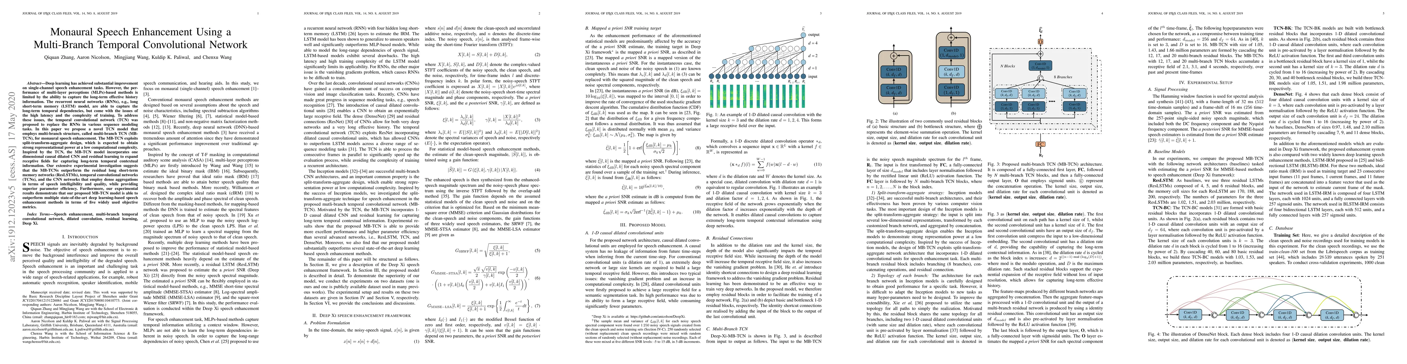 This paper proposes a multi-branch temporal convolutional network (MB-TCN) for monaural speech enhancement, which outperforms existing methods like ResLSTMs and TCNs in terms of speech intelligibility and quality while offering superior parameter efficiency and lower computational complexity.