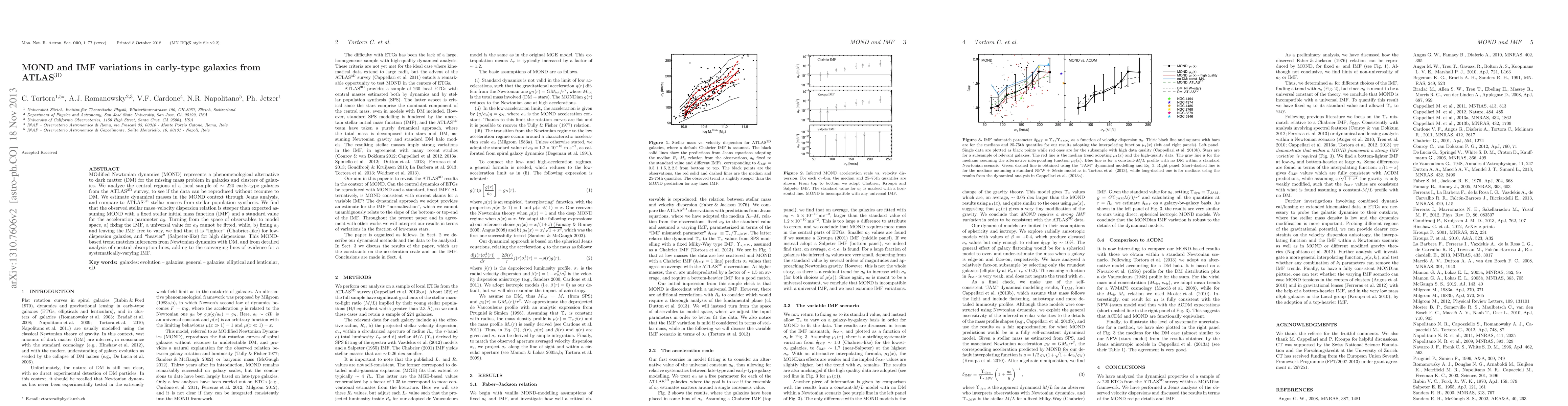 MOdified Newtonian dynamics (MOND) represents a phenomenological alternative to dark matter (DM) for the missing mass problem in galaxies and clusters of galaxies. We analyze the central regions of a local sample of $\sim 220$ early-type galaxies from the $\rm ATLAS^{3D}$ survey, to see if the data can be reproduced without recourse to DM. We estimate dynamical masses in the MOND context through Jeans analysis, and compare to $\rm ATLAS^{3D}$ stellar masses from stellar population synthesis. We find that the observed stellar mass--velocity dispersion relation is steeper than expected assuming MOND with a fixed stellar initial mass function (IMF) and a standard value for the acceleration parameter $a_{\rm 0}$. Turning from the space of observables to model space, a) fixing the IMF, a universal value for $a_{\rm 0}$ cannot be fitted, while, b) fixing $a_{\rm 0}$ and leaving the IMF free to vary, we find that it is "lighter" (Chabrier-like) for low-dispersion galaxies, and "heavier" (Salpeter-like) for high dispersions. This MOND-based trend matches inferences from Newtonian dynamics with DM, and from detailed analysis of spectral absorption lines, adding to the converging lines of evidence for a systematically-varying IMF.
