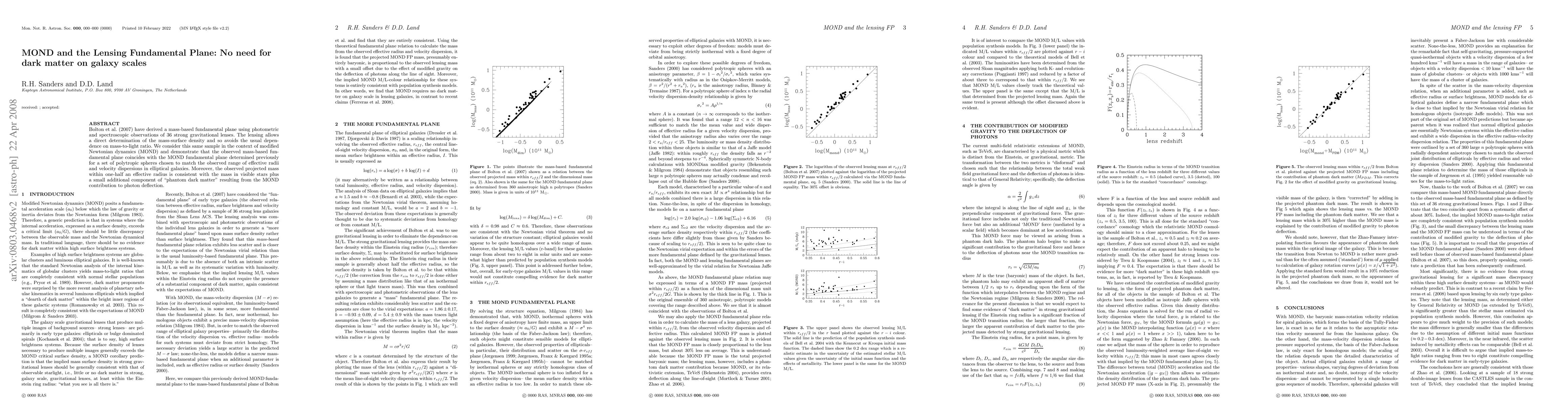 Bolton et al. (2007) use gravitational lensing to derive a mass-based fundamental plane for 36 strong lenses, avoiding dark matter assumptions. They show that this plane aligns with the MOND fundamental plane, suggesting MOND can explain the observed mass distribution without invoking dark matter on galaxy scales.