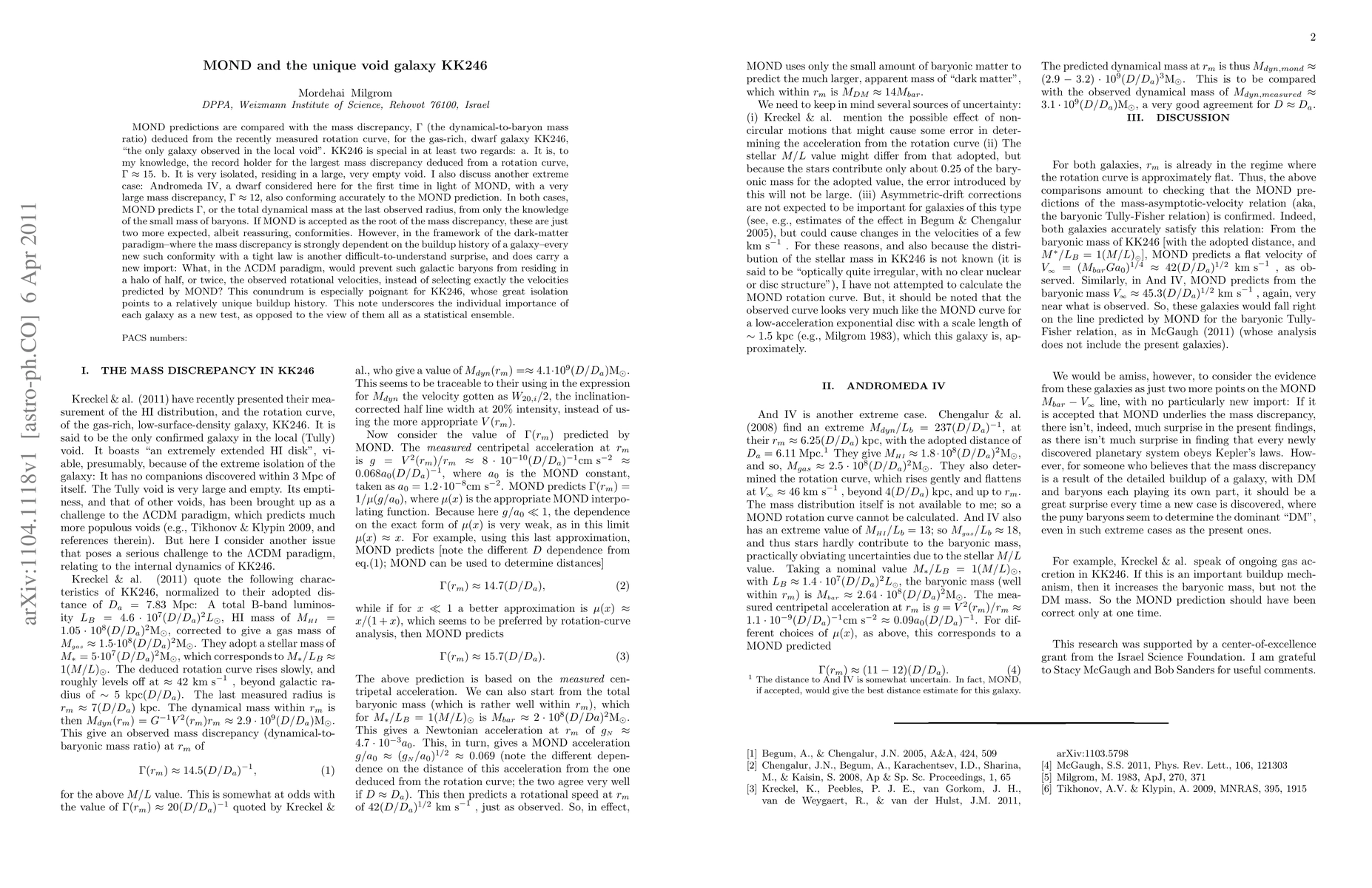 MOND predictions are compared with the mass discrepancy, Gamma (the dynamical-to-baryon mass ratio) deduced from the recently measured rotation curve, for the gas-rich, dwarf galaxy KK246, "the only galaxy observed in the local void". KK246 is special in at least two regards: a. It is, to my knowledge, the record holder for the largest mass discrepancy deduced from a rotation curve, Gamma= 15. b. It is very isolated, residing in a large, very empty void. I also discuss another extreme case: Andromeda IV, a dwarf considered here for the first time in light of MOND, with a very large mass discrepancy, Gamma =12, also conforming accurately to the MOND prediction. In both cases, MOND predicts Gamma, or the total dynamical mass at the last observed radius, from only the knowledge of the small mass of baryons. If MOND is accepted as the root of the mass discrepancy, these are just two more expected, albeit reassuring, conformities. However, in the framework of the dark-matter paradigm--where the mass discrepancy is strongly dependent on the buildup history of a galaxy--every new such conformity with a tight law is another difficult-to-understand surprise, and does carry a new import: What, in the LCDM paradigm, would prevent such galactic baryons from residing in a halo of half, or twice, the observed rotational velocities, instead of selecting exactly the velocities predicted by MOND? This conundrum is especially poignant for KK246, whose great isolation points to a relatively unique buildup history. This note underscores the individual importance of each galaxy as a new test, as opposed to the view of them all as a statistical ensemble.