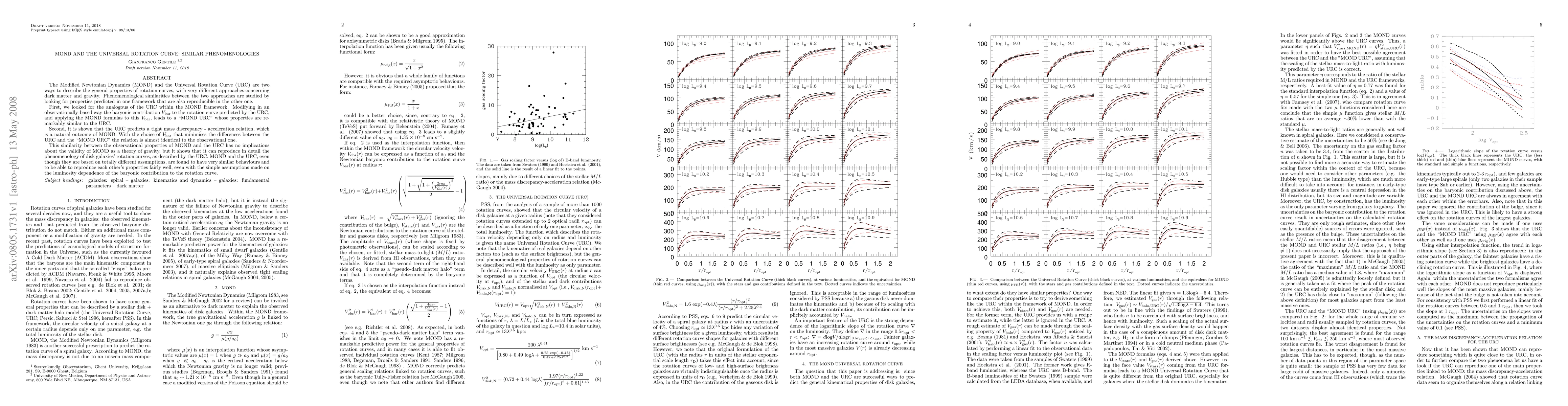 This paper investigates the phenomenological similarities between Modified Newtonian Dynamics (MOND) and the Universal Rotation Curve (URC) by showing that modifying the baryonic contribution in the URC and applying MOND formulas yields a "MOND URC" that closely mirrors the URC. It also demonstrates that the URC predicts a mass discrepancy-acceleration relation consistent with MOND, suggesting MOND can reproduce the phenomenology of disk galaxies' rotation curves described by the URC.