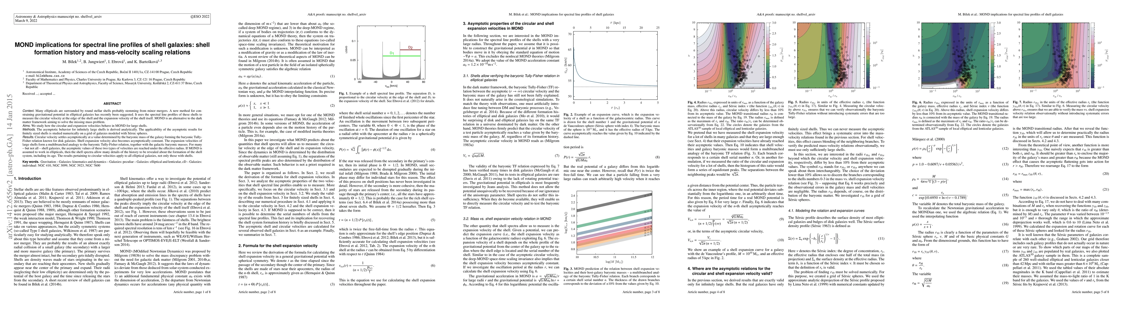 This paper explores the implications of MOND on the spectral line profiles of shell galaxies, finding that circular and expansion velocities in MOND align with the baryonic Tully-Fisher relation for large shells. The study reveals that shell formation history and mass-velocity scaling relations can be inferred from shell spectral lines under MOND.