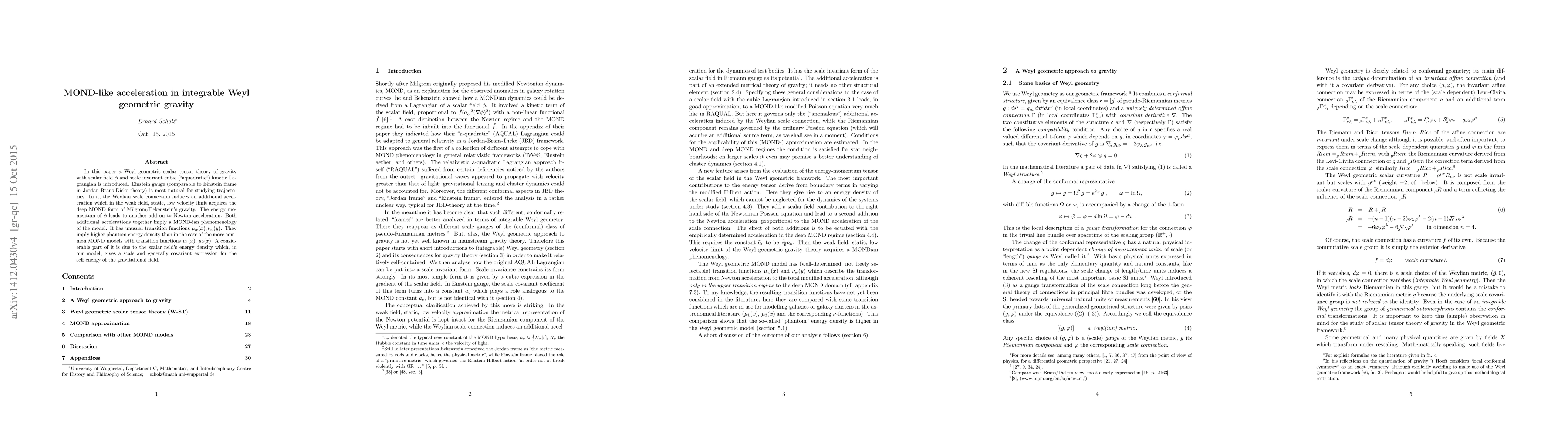 In this paper a Weyl geometric scalar tensor theory of gravity with scalar field $\Phi$ and scale invariant cubic ("aquadratic") kinetic Lagrangian is introduced. Einstein gauge (comparable to Einstein frame in Jordan-Brans-Dicke theory) is most natural for studying trajectories. In it, the Weylian scale connection induces an additional acceleration which in the weak field, static, low velocity limit acquires the deep MOND form of Milgrom/Bekenstein's gravity. The energy momentum of $\Phi$ leads to another add on to Newton acceleration. Both additional accelerations together imply a MOND-ian phenomenology of the model. It has unusual transition functions. They imply higher phantom energy density than in the case of the more common MOND models with transition functions $\mu_1(x), \, \mu_2(x)$. A considerable part of it is due to the scalar field's energy density which, in our model, gives a scale and generally covariant expression for the self-energy of the gravitational field.
