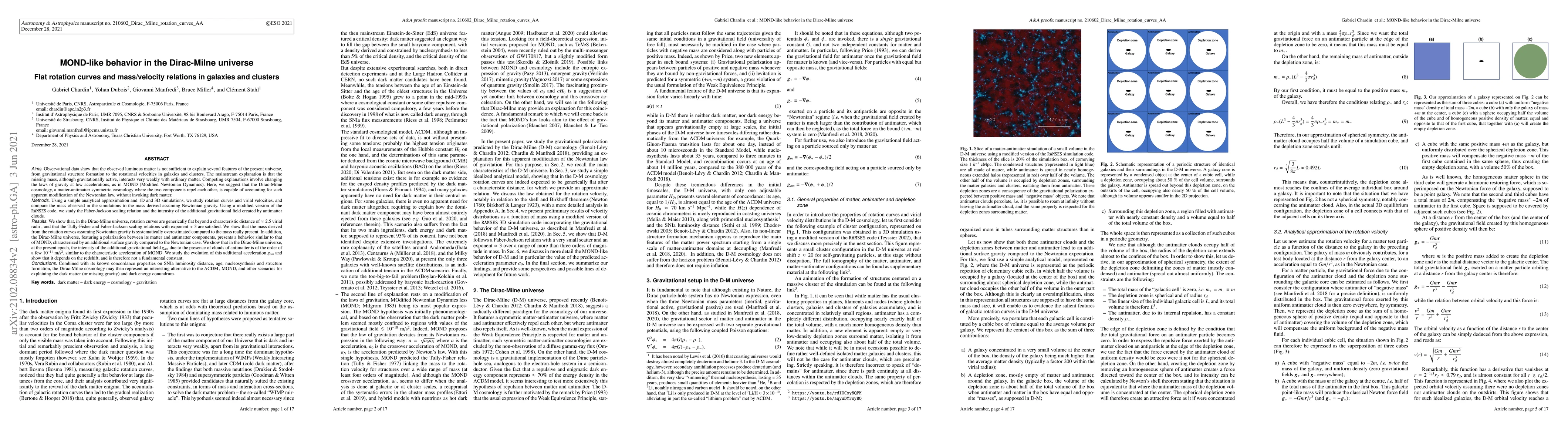 The Dirac-Milne universe, featuring matter-antimatter repulsion, exhibits flat rotation curves and a Tully-Fisher relation similar to MOND, with an additional gravitational field of order $10^{-11}$ m/s$^2$. This cosmology provides an alternative to $\Lambda$CDM for explaining dark matter and dark energy.