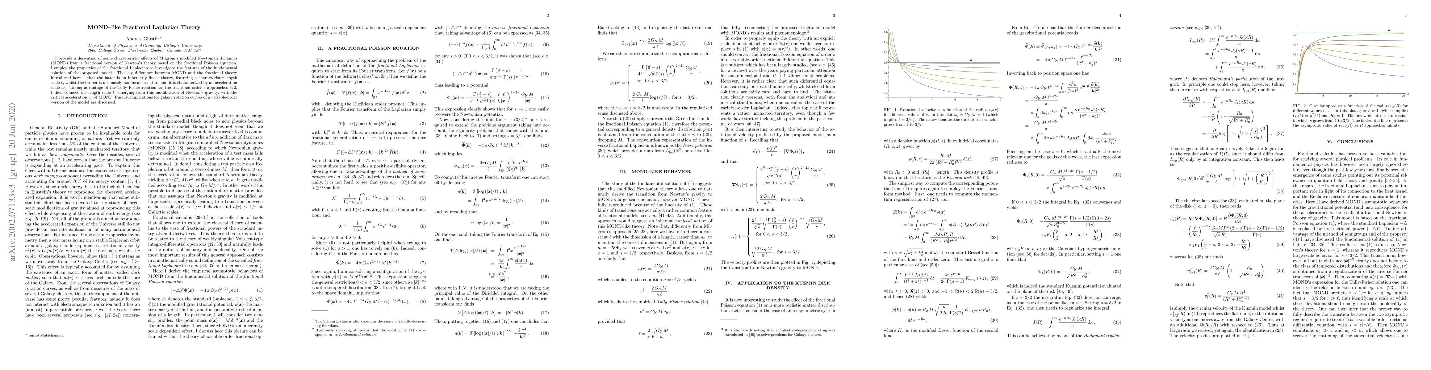 This paper derives MOND-like effects from a fractional Laplacian theory, showing that the linear fractional model introduces a characteristic length scale $\ell$ while MOND is nonlinear and characterized by an acceleration scale $a_0$. The study links $\ell$ to $a_0$ as the fractional order approaches $3/2$, and discusses implications for galaxy rotation curves.