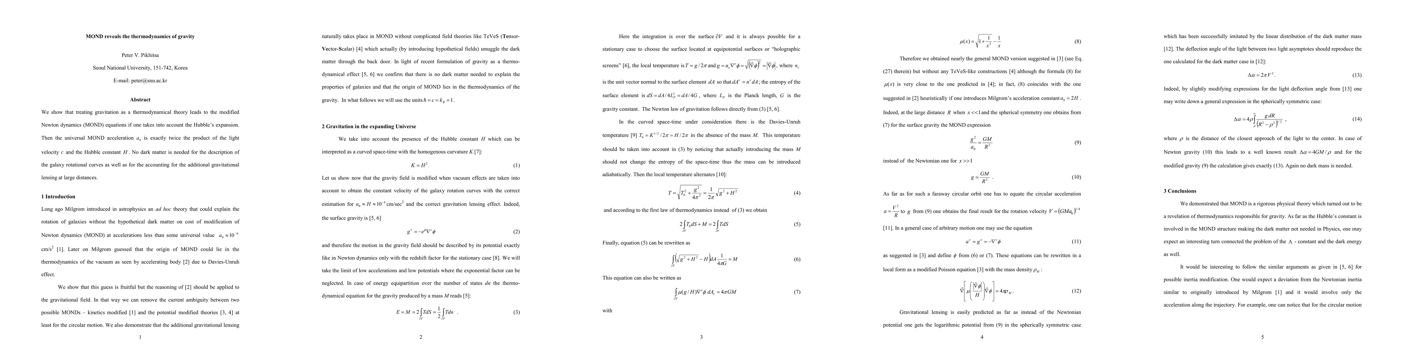 We show that treating gravitation as a thermodynamical theory leads to the modified Newton dynamics (MOND) equations if one takes into account the Hubble's expansion. Then the universal MOND acceleration a0 is exactly twice the product of the light velocity c and the Hubble constant H. No dark matter is needed for the description of the galaxy rotational curves as well as for the accounting for the additional gravitational lensing at large distances.