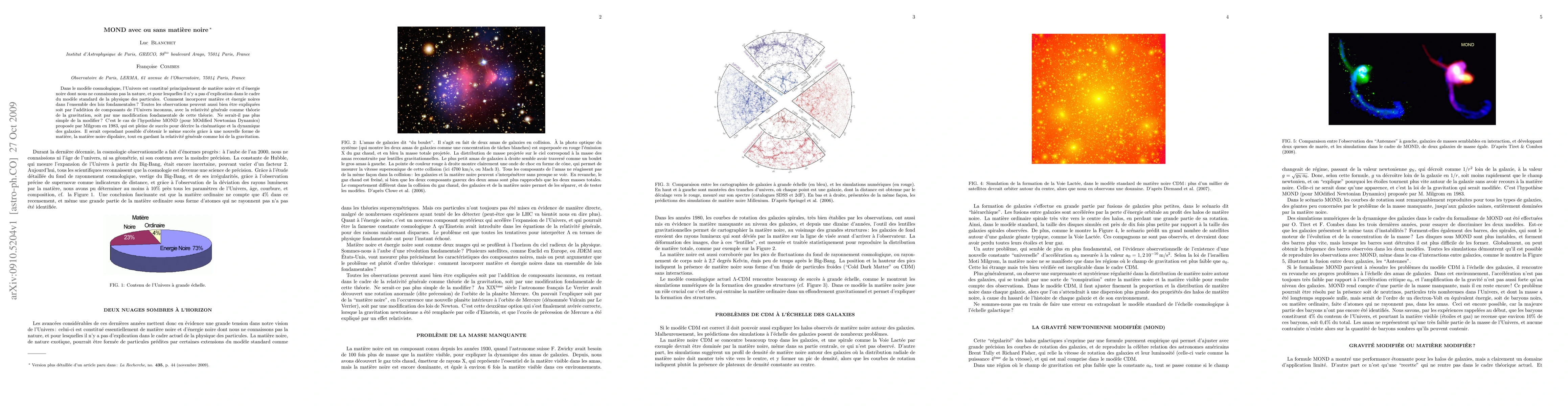 The paper discusses MOND (Modified Newtonian Dynamics) as an alternative to dark matter, comparing it with the standard CDM (Cold Dark Matter) model. It explores how MOND can explain galactic rotation curves and large-scale cosmic structure formation without invoking dark matter.