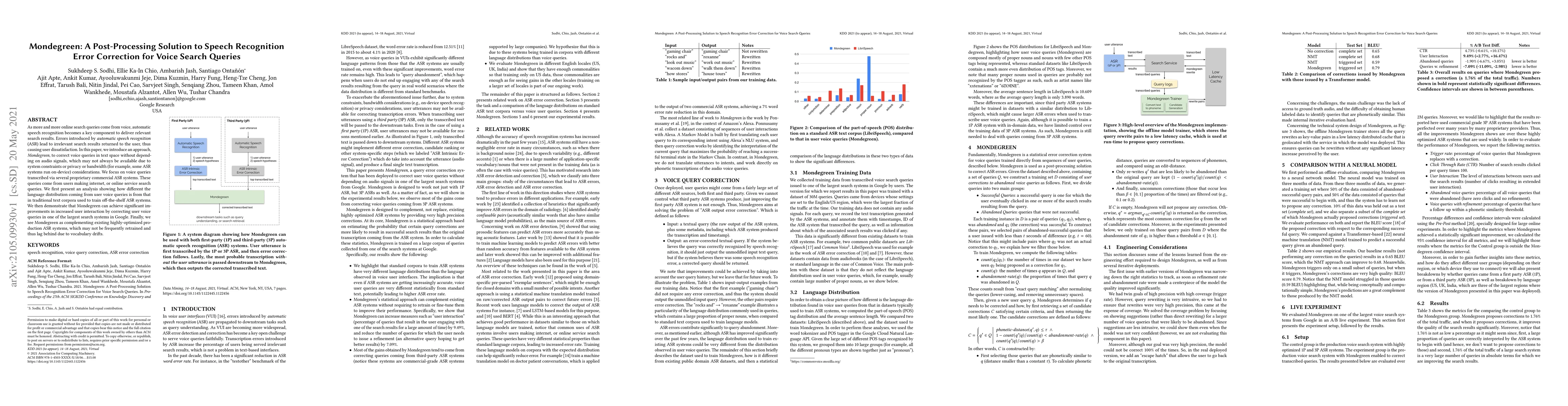 As more and more online search queries come from voice, automatic speech recognition becomes a key component to deliver relevant search results. Errors introduced by automatic speech recognition (ASR) lead to irrelevant search results returned to the user, thus causing user dissatisfaction. In this paper, we introduce an approach, Mondegreen, to correct voice queries in text space without depending on audio signals, which may not always be available due to system constraints or privacy or bandwidth (for example, some ASR systems run on-device) considerations. We focus on voice queries transcribed via several proprietary commercial ASR systems. These queries come from users making internet, or online service search queries. We first present an analysis showing how different the language distribution coming from user voice queries is from that in traditional text corpora used to train off-the-shelf ASR systems. We then demonstrate that Mondegreen can achieve significant improvements in increased user interaction by correcting user voice queries in one of the largest search systems in Google. Finally, we see Mondegreen as complementing existing highly-optimized production ASR systems, which may not be frequently retrained and thus lag behind due to vocabulary drifts.