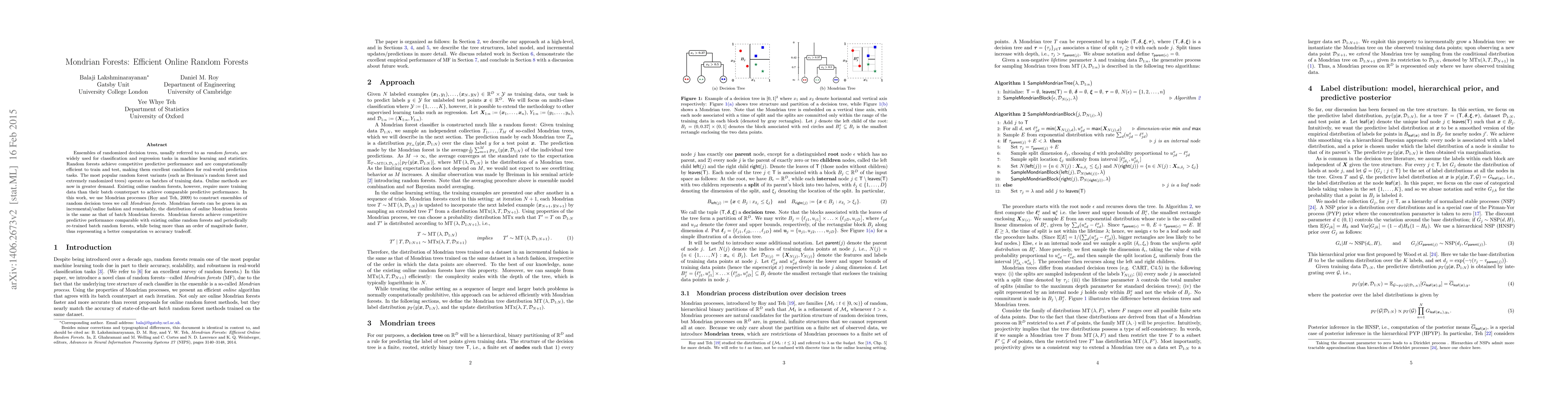 Mondrian forests are efficient online ensembles of random decision trees that utilize Mondrian processes to maintain performance comparable to batch random forests while being significantly faster to train and update. They achieve competitive predictive accuracy and represent a superior trade-off between computation and accuracy.