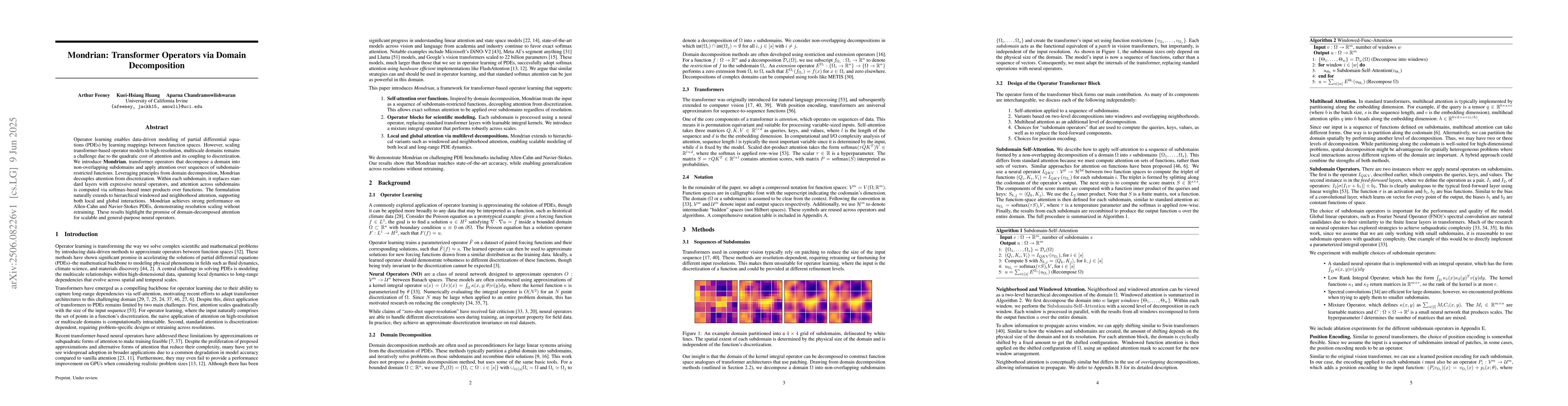 Operator learning enables data-driven modeling of partial differential equations (PDEs) by learning mappings between function spaces. However, scaling transformer-based operator models to high-resolution, multiscale domains remains a challenge due to the quadratic cost of attention and its coupling to discretization. We introduce \textbf{Mondrian}, transformer operators that decompose a domain into non-overlapping subdomains and apply attention over sequences of subdomain-restricted functions. Leveraging principles from domain decomposition, Mondrian decouples attention from discretization. Within each subdomain, it replaces standard layers with expressive neural operators, and attention across subdomains is computed via softmax-based inner products over functions. The formulation naturally extends to hierarchical windowed and neighborhood attention, supporting both local and global interactions. Mondrian achieves strong performance on Allen-Cahn and Navier-Stokes PDEs, demonstrating resolution scaling without retraining. These results highlight the promise of domain-decomposed attention for scalable and general-purpose neural operators.