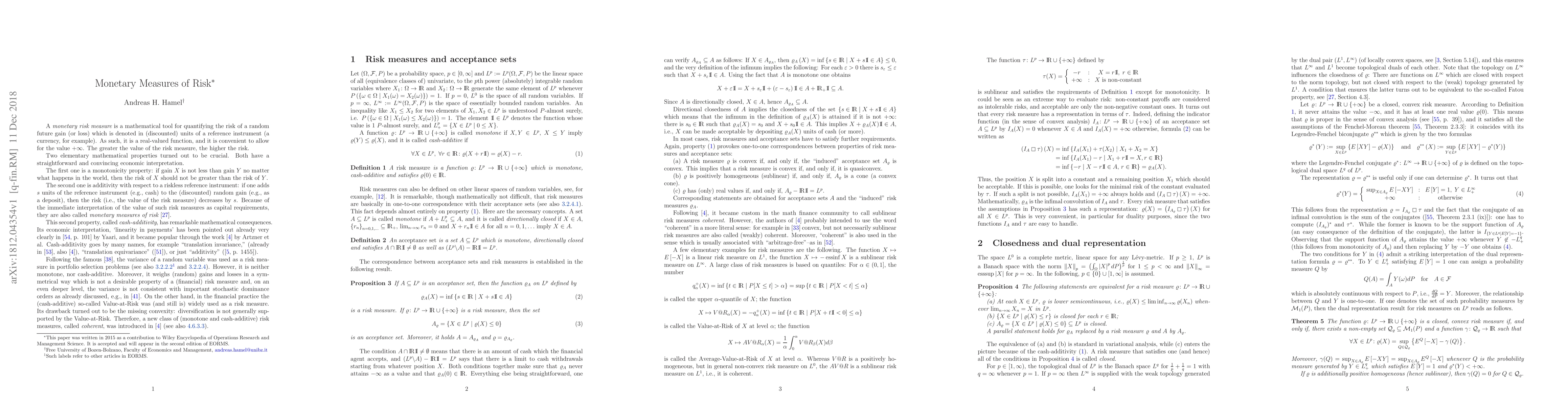 This paper surveys monetary measures of risk, presenting them as monotone and cash additive functions on random variables, and discusses their primal and dual representations, construction methods, and extensions to broader contexts.