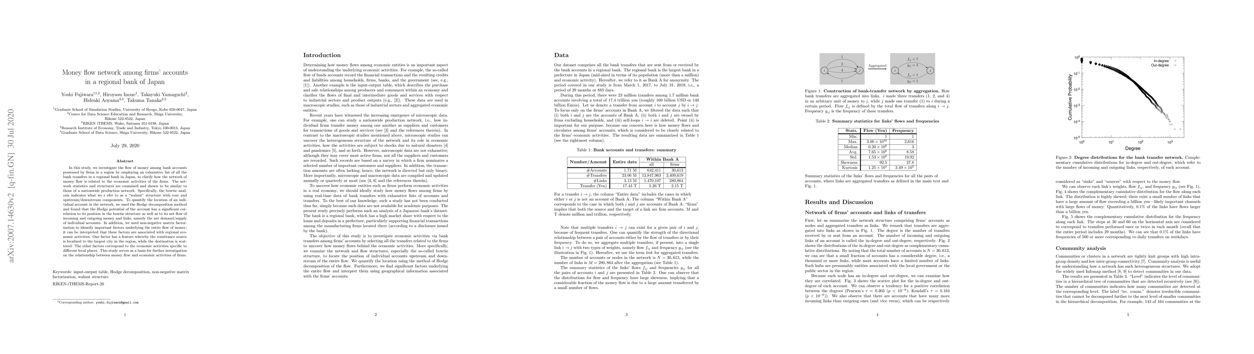 This study analyzes the money flow network among firms' accounts in a regional Japanese bank, revealing a "walnut" structure similar to a nationwide production network. The Hodge decomposition method shows significant correlation between account positions and net flow, while non-negative matrix factorization identifies factors linked to regional economic activities.