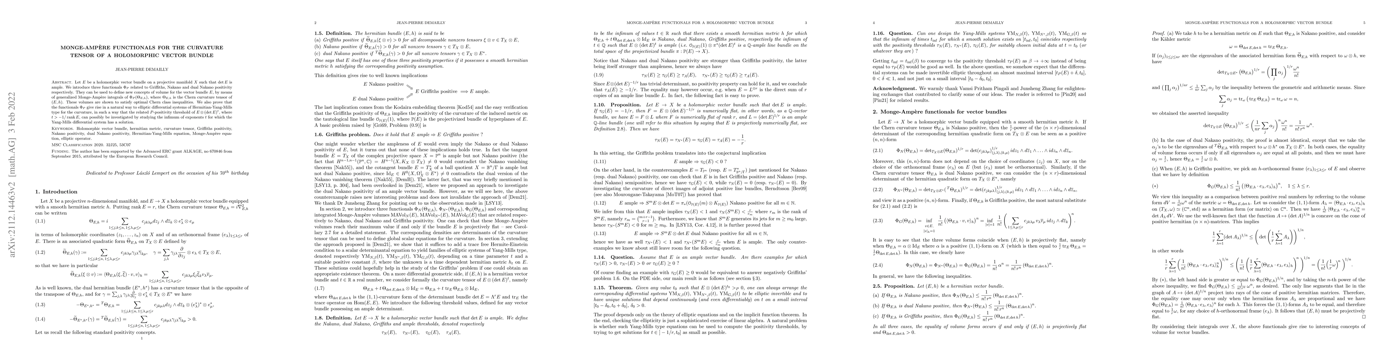 This paper introduces three Monge-Ampère functionals related to Griffiths, Nakano, and dual Nakano positivity for holomorphic vector bundles on projective manifolds. These functionals define new volume concepts for the vector bundle, satisfying optimal Chern class inequalities and leading to elliptic differential systems of Hermitian-Yang-Mills type.