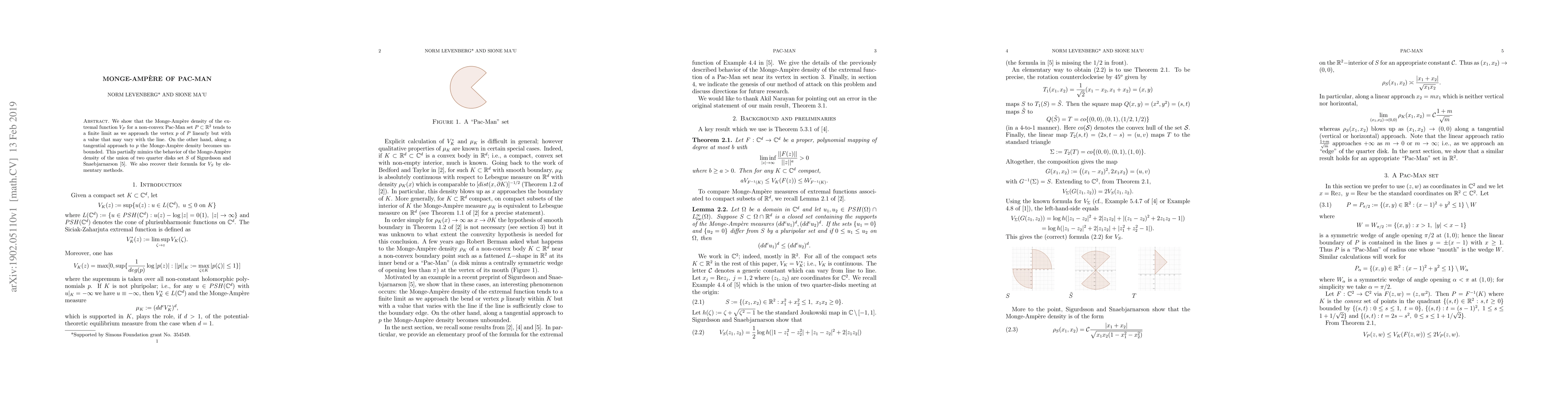 We show that the Monge-Amp\`ere density of the extremal function $V_P$ for a non-convex Pac-Man set $P\subset {\bf R}^2$ tends to a finite limit as we approach the vertex $p$ of $P$ linearly but with a value that may vary with the line. On the other hand, along a tangential approach to $p$ the Monge-Amp\`ere density becomes unbounded. This partially mimics the behavior of the Monge-Amp\`ere density of the union of two quarter disks set $S$ of Sigurdsson and Snaebjarnarson. We also recover their formula for $V_S$ by elementary methods.