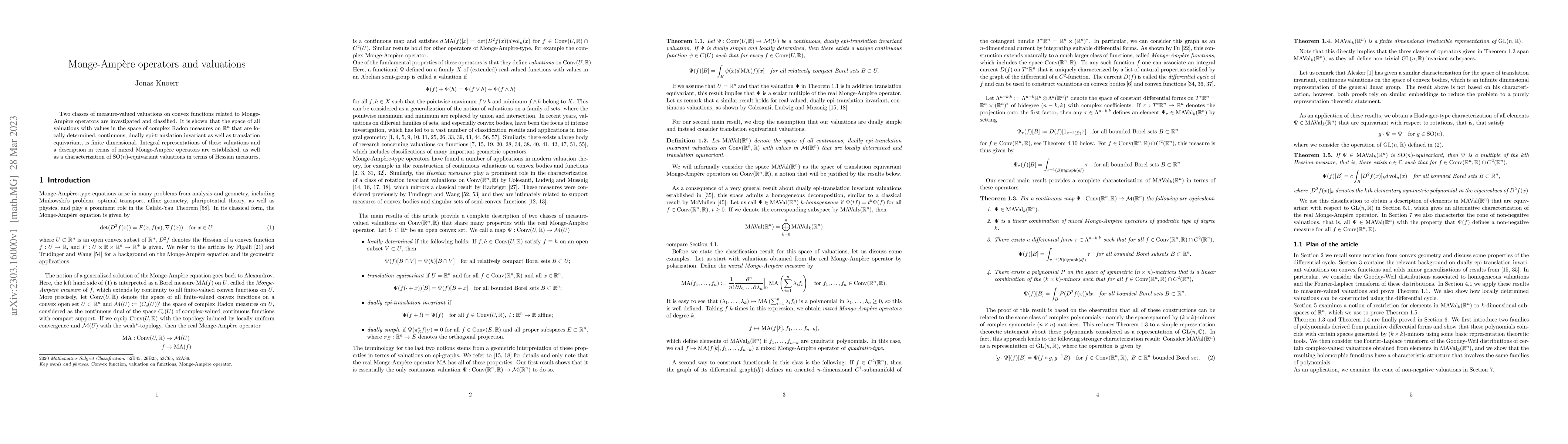 This paper investigates measure-valued valuations on convex functions linked to Monge-Ampère operators, proving that the space of specified valuations is finite-dimensional and providing integral representations and characterizations involving mixed Monge-Ampère operators and Hessian measures.