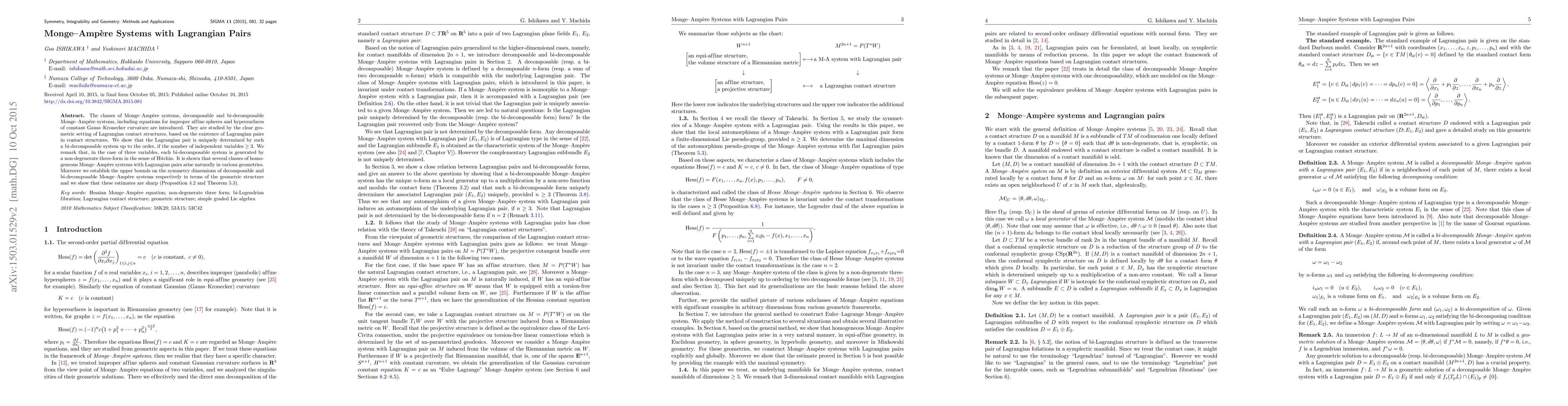 This paper introduces classes of Monge-Ampère systems, including those for improper affine spheres and hypersurfaces of constant Gauss-Kronecker curvature, studied via Lagrangian contact structures. It establishes that Lagrangian pairs are uniquely determined by bi-decomposable systems when the number of independent variables is at least three.