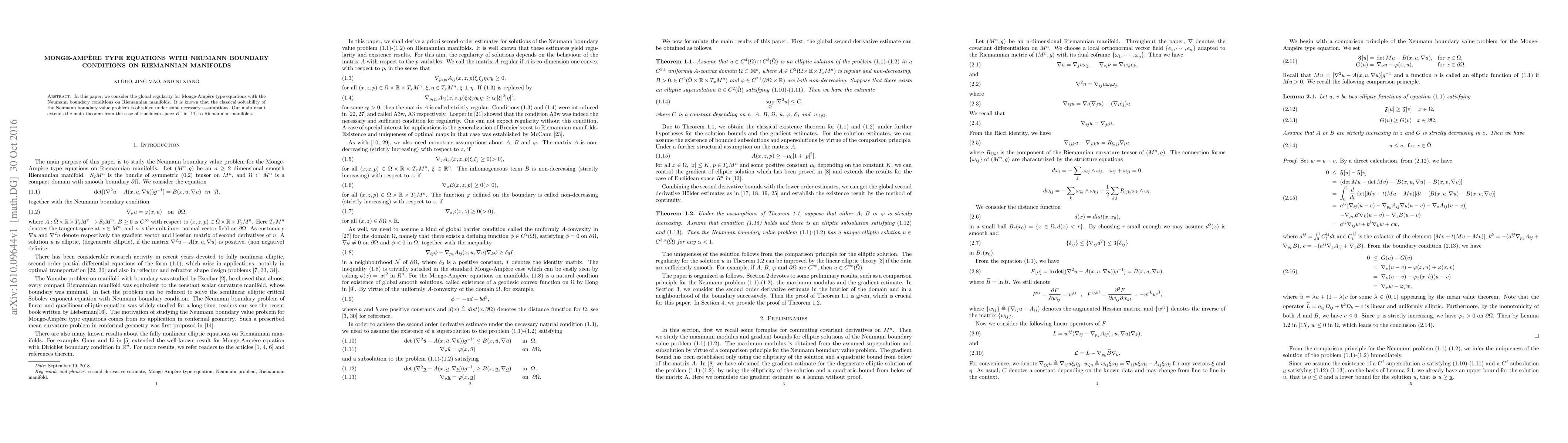 The paper extends the global regularity result for Monge-Ampère type equations with Neumann boundary conditions from Euclidean space to Riemannian manifolds.