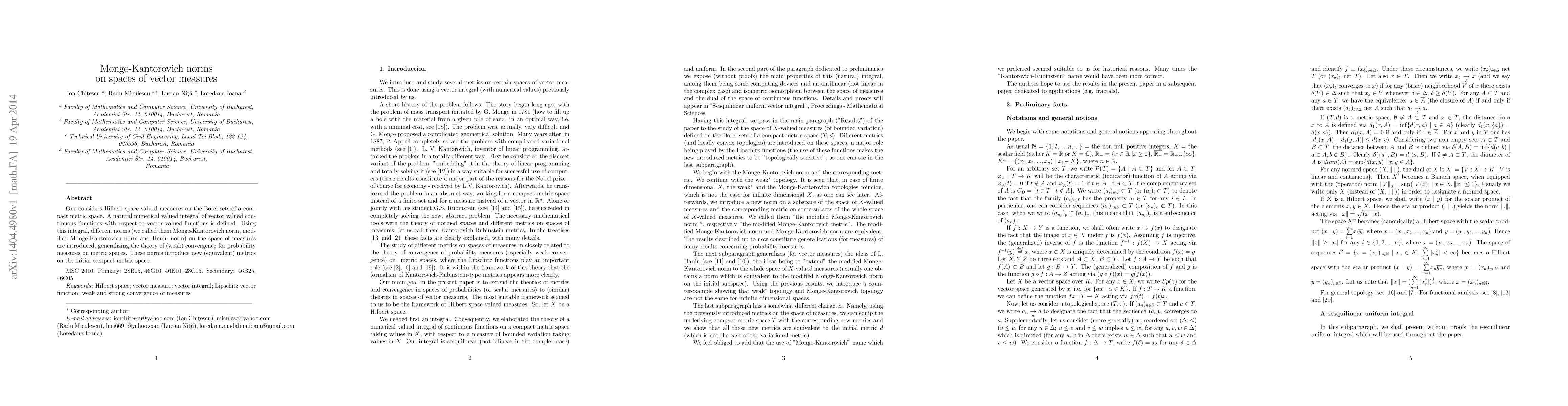 This paper introduces Monge-Kantorovich norms on spaces of vector measures, defining a new integral for vector-valued continuous functions. It generalizes the theory of convergence for probability measures, introducing equivalent metrics on compact metric spaces through these norms.