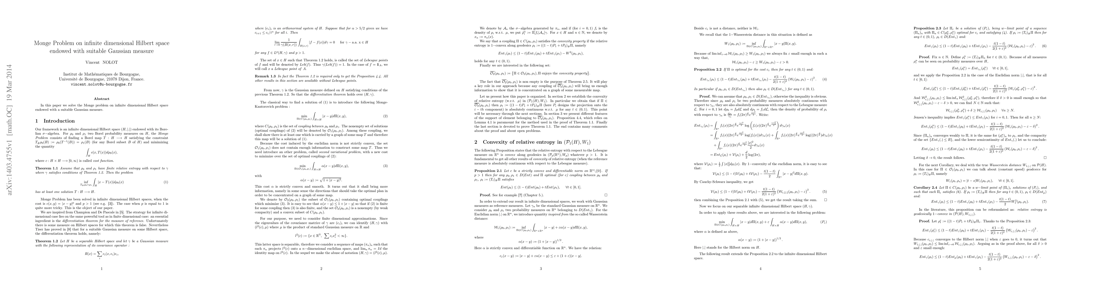 Summary: This paper solves the Monge problem in an infinite-dimensional Hilbert space equipped with a Gaussian measure that fulfills the Lebesgue differentiation theorem, providing a novel solution approach in this complex setting.