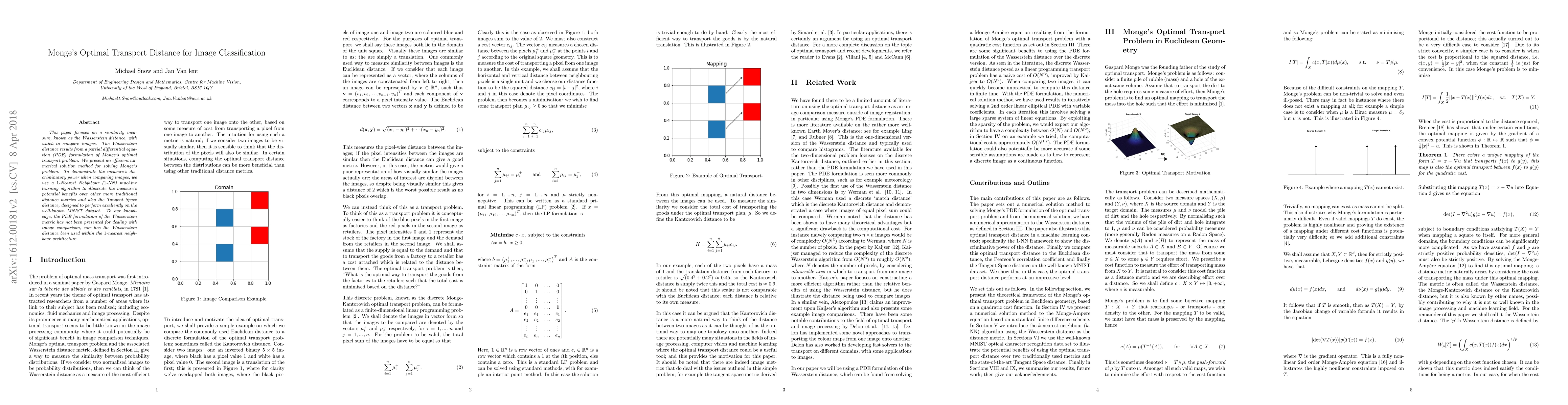 This paper focuses on a similarity measure, known as the Wasserstein distance, with which to compare images. The Wasserstein distance results from a partial differential equation (PDE) formulation of Monge's optimal transport problem. We present an efficient numerical solution method for solving Monge's problem. To demonstrate the measure's discriminatory power when comparing images, we use a $1$-Nearest Neighbour ($1$-NN) machine learning algorithm to illustrate the measure's potential benefits over other more traditional distance metrics and also the Tangent Space distance, designed to perform excellently on the well-known MNIST dataset. To our knowledge, the PDE formulation of the Wasserstein metric has not been presented for dealing with image comparison, nor has the Wasserstein distance been used within the $1$-nearest neighbour architecture.