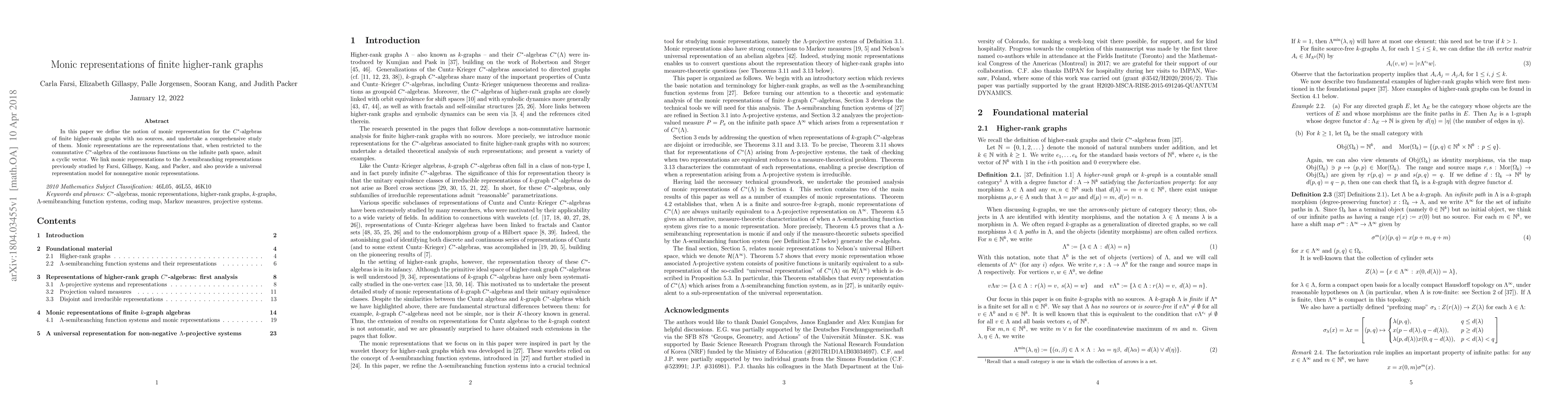 In this paper we define the notion of monic representation for the $C^*$-algebras of finite higher-rank graphs with no sources, and undertake a comprehensive study of them. Monic representations are the representations that, when restricted to the commutative $C^*$-algebra of the continuous functions on the infinite path space, admit a cyclic vector. We link monic representations to the $\Lambda$-semibranching representations previously studied by Farsi, Gillaspy, Kang, and Packer, and also provide a universal representation model for nonnegative monic representations.