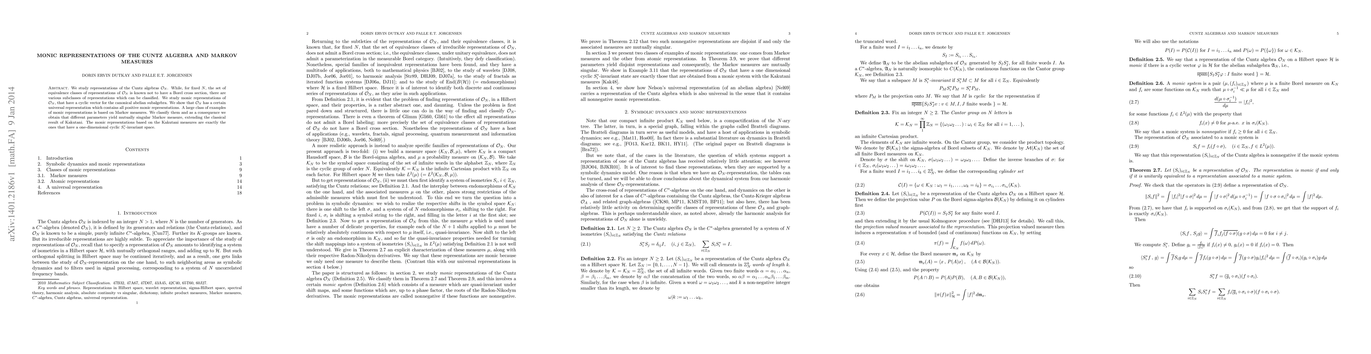 This research paper studies representations of the Cuntz algebra, specifically monic representations with a cyclic vector for the canonical abelian subalgebra. It classifies Markov measures as a large class of examples of these representations and shows that different parameters yield mutually singular measures.