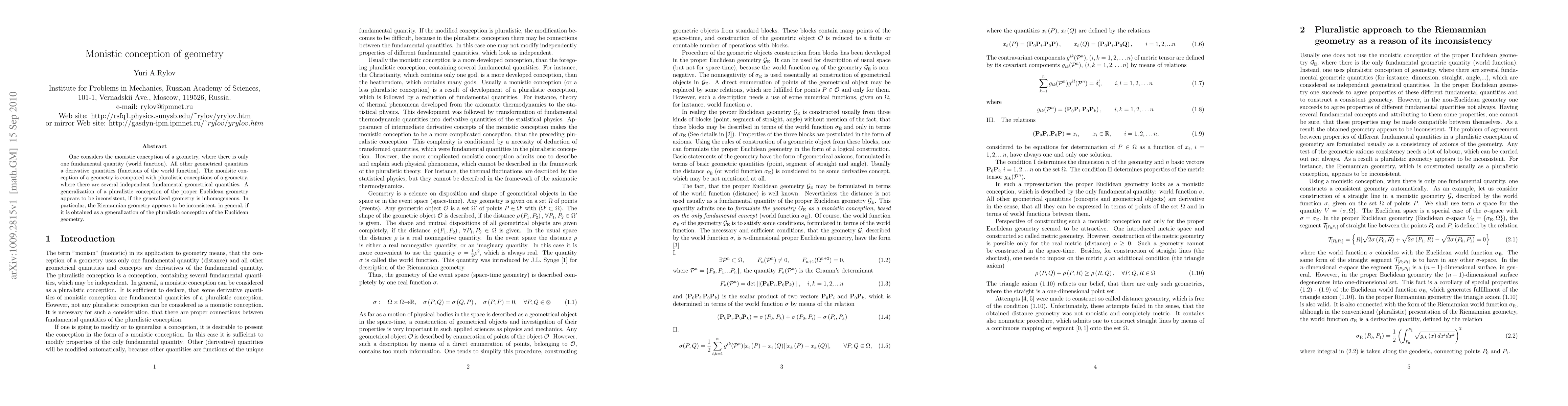 One considers the monistic conception of a geometry, where there is only one fundamental quantity (world function). All other geometrical quantities a derivative quantities (functions of the world function). The monisitc conception of a geometry is compared with pluralistic conceptions of a geometry, where there are several independent fundamental geometrical quantities. A generalization of a pluralistic conception of the proper Euclidean geometry appears to be inconsistent, if the generalized geometry is inhomogeneous. In particular, the Riemannian geometry appears to be inconsistent, in general, if it is obtained as a generalization of the pluralistic conception of the Euclidean geometry.