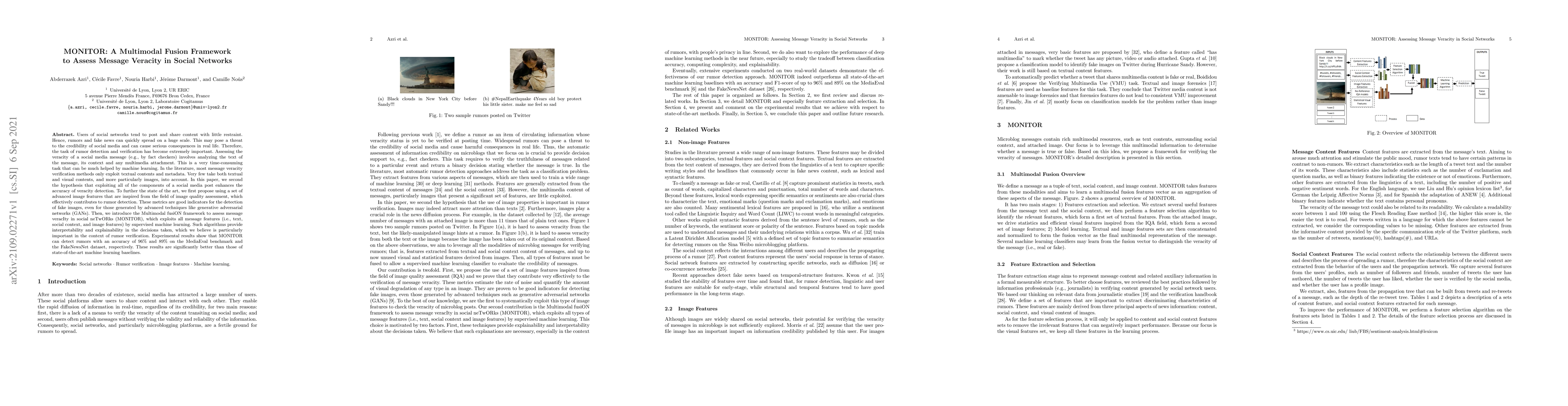 The MONITOR framework proposes a multimodal fusion approach to enhance the accuracy of rumor detection in social networks by integrating text, social context, and advanced image features. Experimental results demonstrate superior performance, achieving 96% accuracy on MediaEval and 89% on FakeNewsNet, outperforming existing methods.
