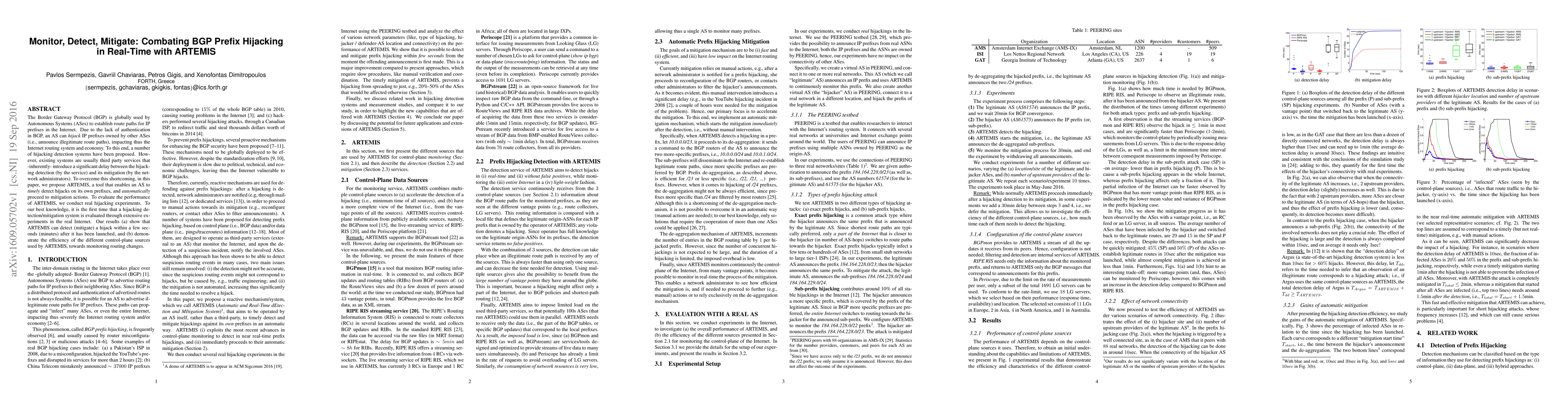 This paper proposes ARTEMIS, a real-time tool for Autonomous Systems to detect and mitigate BGP prefix hijacking autonomously, reducing delays compared to third-party services. Experimental results show ARTEMIS can detect and mitigate hijacks within seconds to minutes, demonstrating effective real-time monitoring.