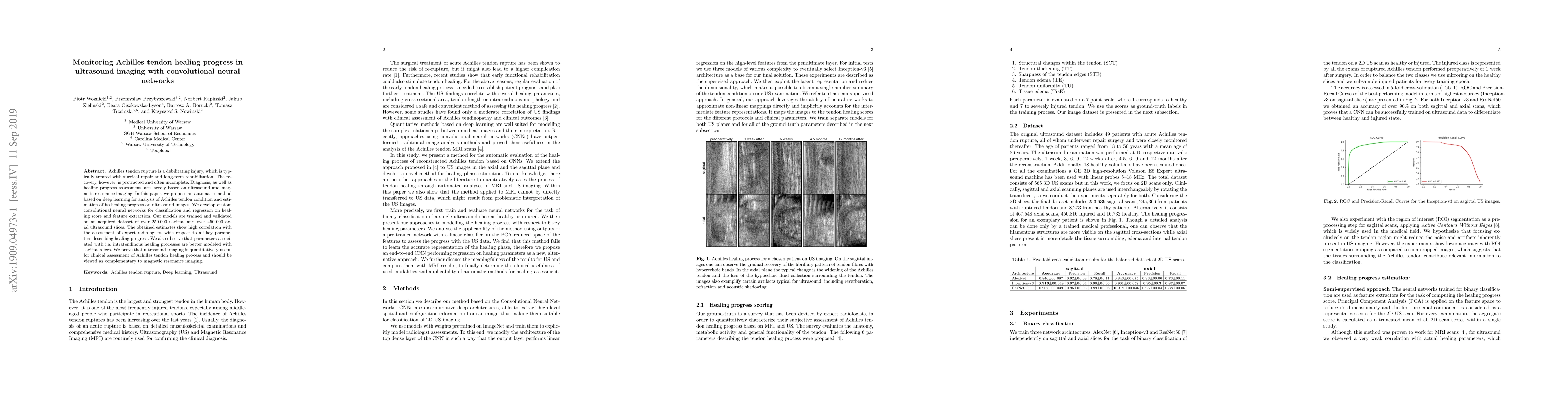 This paper proposes a deep learning method using convolutional neural networks to automatically assess Achilles tendon healing progress from ultrasound images, showing high correlation with expert radiologist assessments. The study demonstrates that sagittal slices are particularly effective for modeling intratendinous healing processes.