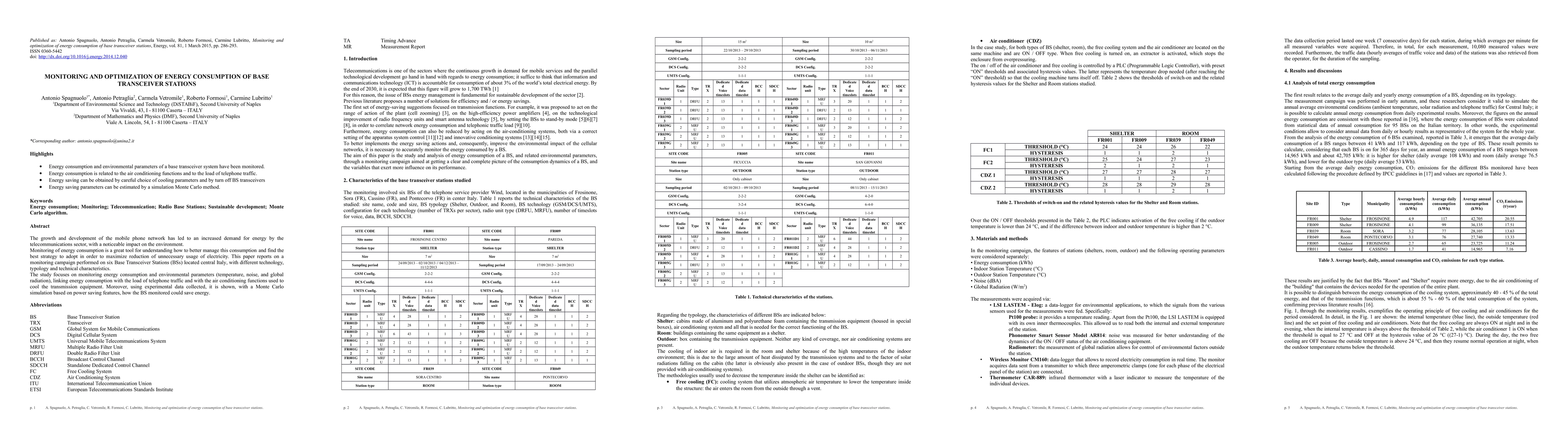 The growth and development of the mobile phone network has led to an increased demand for energy by the telecommunications sector, with a noticeable impact on the environment. Monitoring of energy consumption is a great tool for understanding how to better manage this consumption and find the best strategy to adopt in order to maximize reduction of unnecessary usage of electricity. This paper reports on a monitoring campaign performed on six Base Transceiver Stations (BSs) located central Italy, with different technology, typology and technical characteristics. The study focuses on monitoring energy consumption and environmental parameters (temperature, noise, and global radiation), linking energy consumption with the load of telephone traffic and with the air conditioning functions used to cool the transmission equipment. Moreover, using experimental data collected, it is shown, with a Monte Carlo simulation based on power saving features, how the BS monitored could save energy.