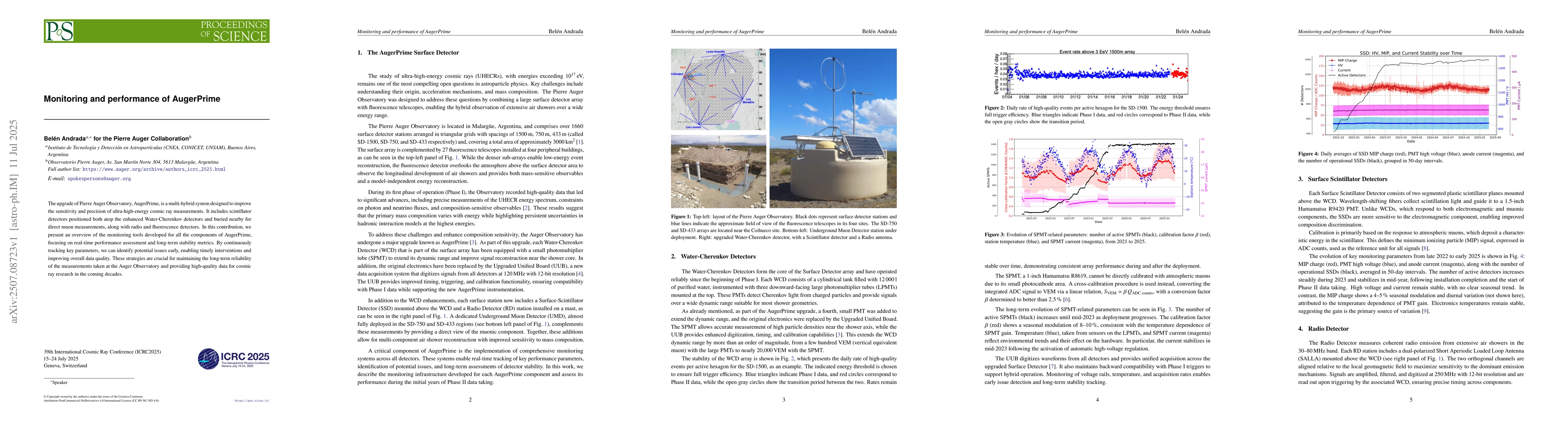 The research presents an overview of monitoring tools developed for AugerPrime, focusing on real-time performance assessment and long-term stability metrics for all components, including scintillator detectors, radio, and fluorescence detectors.