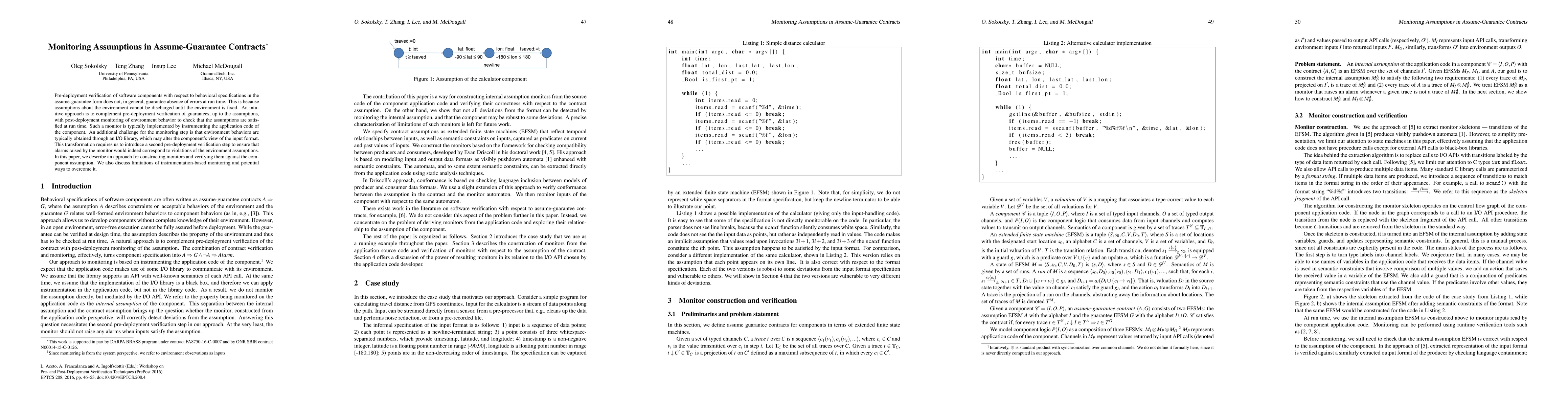 Pre-deployment verification of software components with respect to behavioral specifications in the assume-guarantee form does not, in general, guarantee absence of errors at run time. This is because assumptions about the environment cannot be discharged until the environment is fixed. An intuitive approach is to complement pre-deployment verification of guarantees, up to the assumptions, with post-deployment monitoring of environment behavior to check that the assumptions are satisfied at run time. Such a monitor is typically implemented by instrumenting the application code of the component. An additional challenge for the monitoring step is that environment behaviors are typically obtained through an I/O library, which may alter the component's view of the input format. This transformation requires us to introduce a second pre-deployment verification step to ensure that alarms raised by the monitor would indeed correspond to violations of the environment assumptions. In this paper, we describe an approach for constructing monitors and verifying them against the component assumption. We also discuss limitations of instrumentation-based monitoring and potential ways to overcome it.