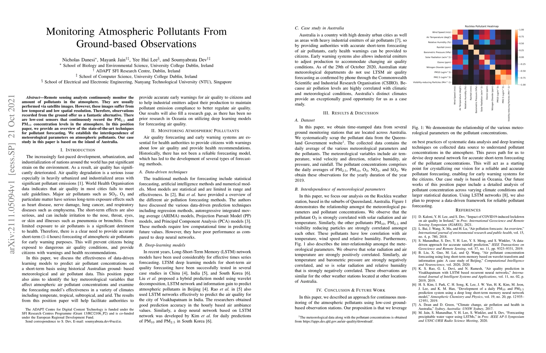 This paper reviews state-of-the-art techniques for monitoring atmospheric pollutants using low-cost ground-based sensors, emphasizing their advantages over satellite imagery. It highlights the interdependence of meteorological factors on pollutant levels and presents a case study focusing on Australia.