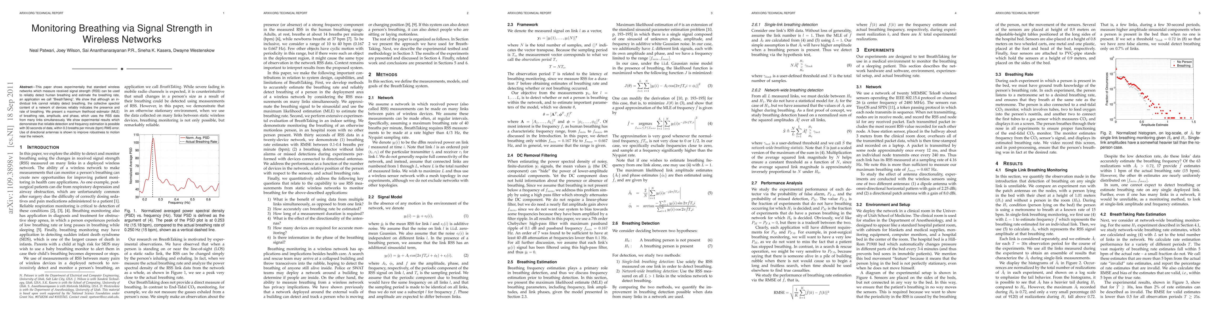 This paper demonstrates that standard wireless networks can detect human breathing and estimate breathing rates using received signal strength (RSS) data, achieving reliable results with a network of devices. The study presents a maximum likelihood estimator to analyze RSS data, showing accurate detection within 0.3 breaths per minute RMS error using 30 seconds of data.