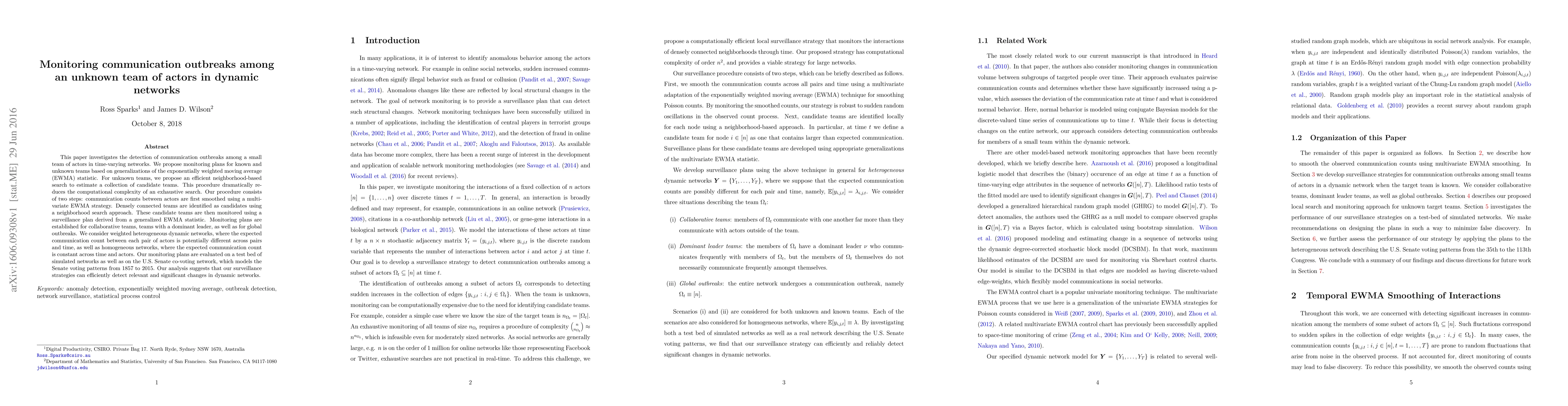 This paper investigates the detection of communication outbreaks among a small team of actors in time-varying networks. We propose monitoring plans for known and unknown teams based on generalizations of the exponentially weighted moving average (EWMA) statistic. For unknown teams, we propose an efficient neighborhood-based search to estimate a collection of candidate teams. This procedure dramatically reduces the computational complexity of an exhaustive search. Our procedure consists of two steps: communication counts between actors are first smoothed using a multivariate EWMA strategy. Densely connected teams are identified as candidates using a neighborhood search approach. These candidate teams are then monitored using a surveillance plan derived from a generalized EWMA statistic. Monitoring plans are established for collaborative teams, teams with a dominant leader, as well as for global outbreaks. We consider weighted heterogeneous dynamic networks, where the expected communication count between each pair of actors is potentially different across pairs and time, as well as homogeneous networks, where the expected communication count is constant across time and actors. Our monitoring plans are evaluated on a test bed of simulated networks as well as on the U.S. Senate co-voting network, which models the Senate voting patterns from 1857 to 2015. Our analysis suggests that our surveillance strategies can efficiently detect relevant and significant changes in dynamic networks.